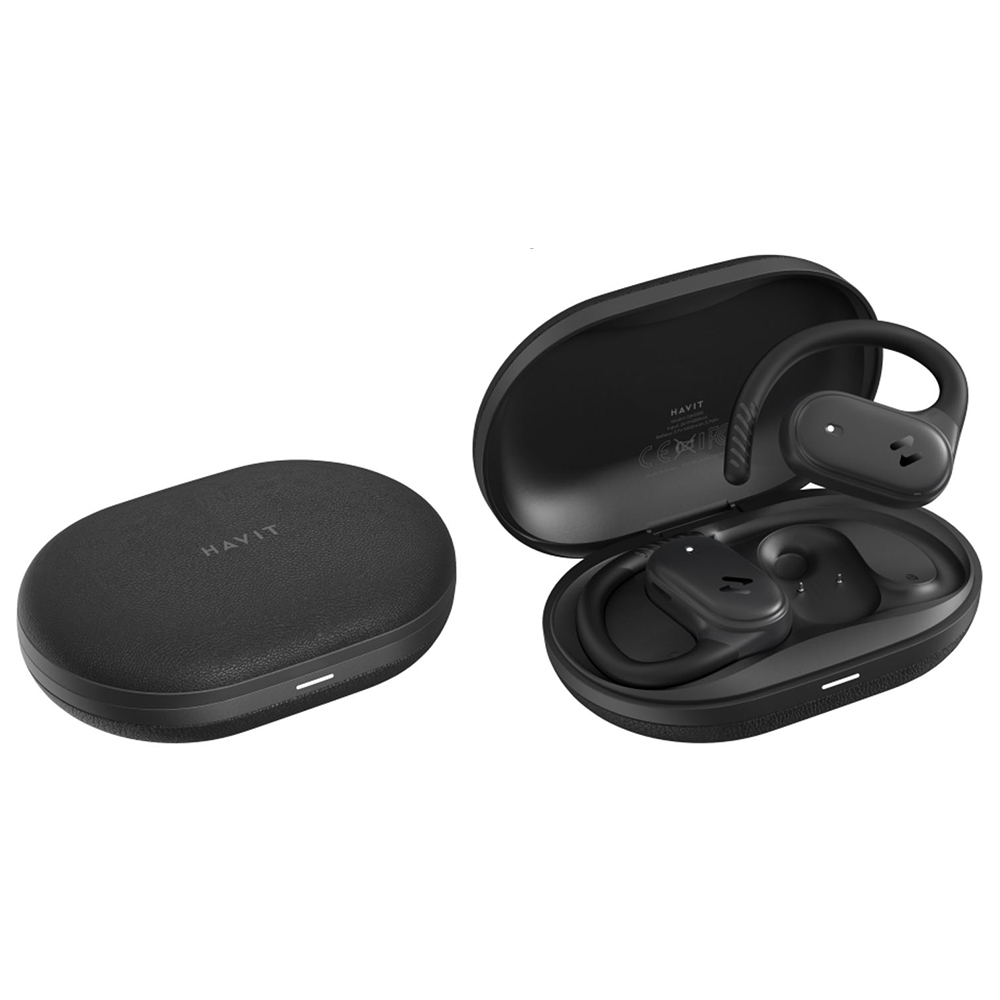 Sluchátka Havit OWS915 se pyšní moderním a minimalistickým designem v elegantní černé barvě. Jejich otevřená konstrukce s ergonomickými háčky za uši zajišťuje bezpečné a stabilní uchycení, které je ideální pro sportovce i pro každodenní nošení. Nabíjecí pouzdro má kompaktní oválný tvar s příjemnou texturou, což usnadňuje jeho přenášení a chrání sluchátka. Díky použití materiálů šetrných k pokožce a paměťového ocelového drátu jsou sluchátka extrémně pohodlná i po hodinách poslechu.