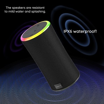 Reproduktor Havit SK833BT se pyšní moderním válcovým tvarem, který se snadno začlení do jakéhokoli interiéru a zároveň je praktický pro přenášení. Jeho tělo je potaženo odolnou černou tkaninou, která mu dodává prémiový vzhled a příjemný pocit na dotek. Dominantou je integrovaný RGB světelný prstenec na horní straně, který nabízí dynamické duhové barvy a efekty reagující na rytmus hudby, čímž vytváří nezapomenutelnou vizuální atmosféru. Na horním panelu naleznete intuitivní ovládací prvky pro snadnou správu přehrávání a světelných režimů. Pro maximální mobilitu je reproduktor vybaven praktickým poutkem.