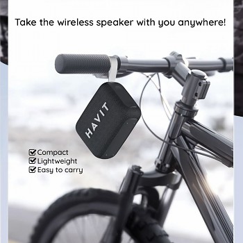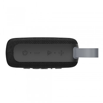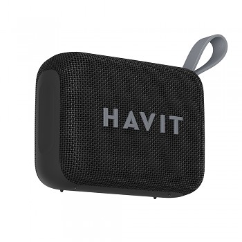 Reproduktor Havit SK874BT se pyšní elegantním a minimalistickým designem v černé barvě. Jeho kompaktní obdélníkový tvar se zaoblenými hranami zajišťuje pohodlné držení a snadnou přenositelnost. Přední strana je potažena odolnou černou síťovinou, která chrání reproduktor a zároveň dodává moderní vzhled. Dominantním prvkem je decentní, ale výrazné logo "HAVIT" v šedé barvě. Na horní straně naleznete intuitivní ovládací prvky pro snadnou manipulaci s hudbou a hovory. Praktické šedé silikonové poutko umožňuje reproduktor snadno zavěsit nebo přenášet, což z něj činí ideálního společníka na cesty, pikniky nebo do kanceláře.