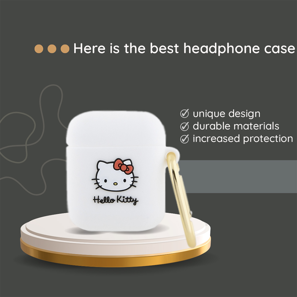 Pouzdro je vyrobeno z prémiového silikonu v elegantní černé barvě, který je příjemný na dotek a zároveň poskytuje vynikající ochranu proti poškrábání, nárazům a prachu. Jeho design je inspirován ikonickou postavičkou Hello Kitty, jejíž 3D hlava s charakteristickou červenou mašlí zdobí přední stranu pouzdra. Pod motivem Hello Kitty je bílým písmem vyveden nápis "Hello Kitty", který dodává pouzdru autentický a hravý vzhled. Součástí balení je také praktická zlatá karabina, díky které můžete pouzdro snadno připnout k batohu, klíčům nebo poutku na opasek a mít tak svá sluchátka vždy po ruce a v bezpečí.
