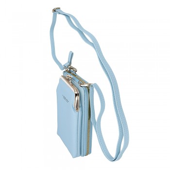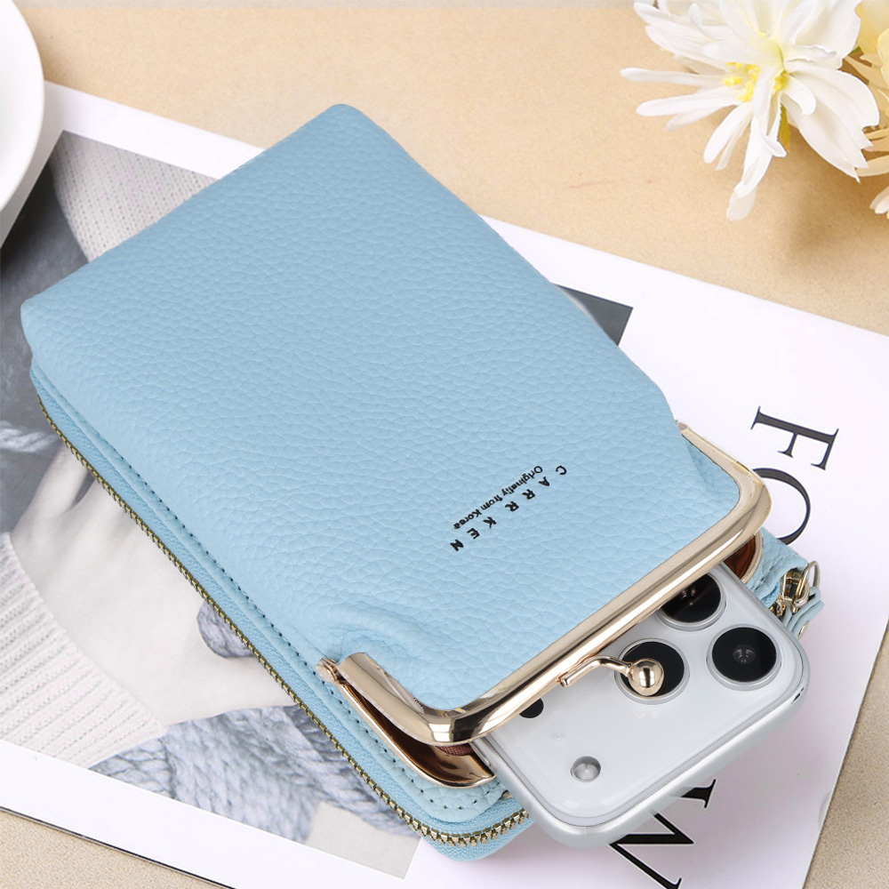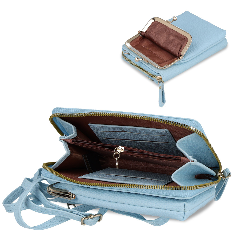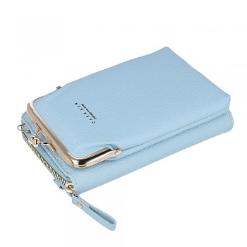 Tato kompaktní taška/peněženka je vyrobena z kvalitní umělé kůže s jemnou texturou, která jí dodává luxusní vzhled a příjemný pocit na dotek. Její světle modrý odstín je svěží a snadno kombinovatelný s různými outfity. Design je promyšlený do posledního detailu – hlavní kapsa na telefon se uzavírá elegantním kovovým klipem ve zlaté barvě, který nejen skvěle vypadá, ale také zajišťuje bezpečné uložení vašeho zařízení. Vedlejší oddíl na zip nabízí dostatek prostoru pro vaše karty, bankovky a drobné mince, díky čemuž můžete mít vše důležité přehledně uspořádané. Součástí je také nastavitelný ramenní popruh, který umožňuje pohodlné nošení přes rameno nebo jako crossbody.