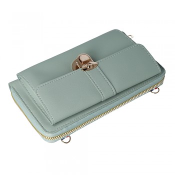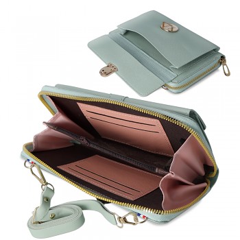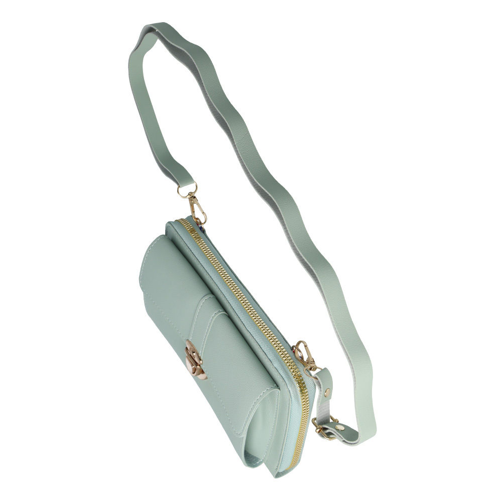 Kabelka GCW06 se pyšní **moderním designem** z kvalitní **umělé kůže** v jemném mátovém odstínu, který dodá vašemu outfitu svěžest a šmrnc. Zlaté kovové detaily, včetně **elegantní spony** a **robustního zipu**, podtrhují její luxusní vzhled a zajišťují **bezpečné uzavření**. Kabelka je vybavena **odnímatelným a nastavitelným popruhem**, což umožňuje nosit ji jako crossbody, přes rameno nebo jako elegantní psaníčko. Vnitřní uspořádání nabízí **několik přihrádek na karty** a prostornou kapsu na zip, což z ní činí ideální volbu pro organizaci vašich věcí.
