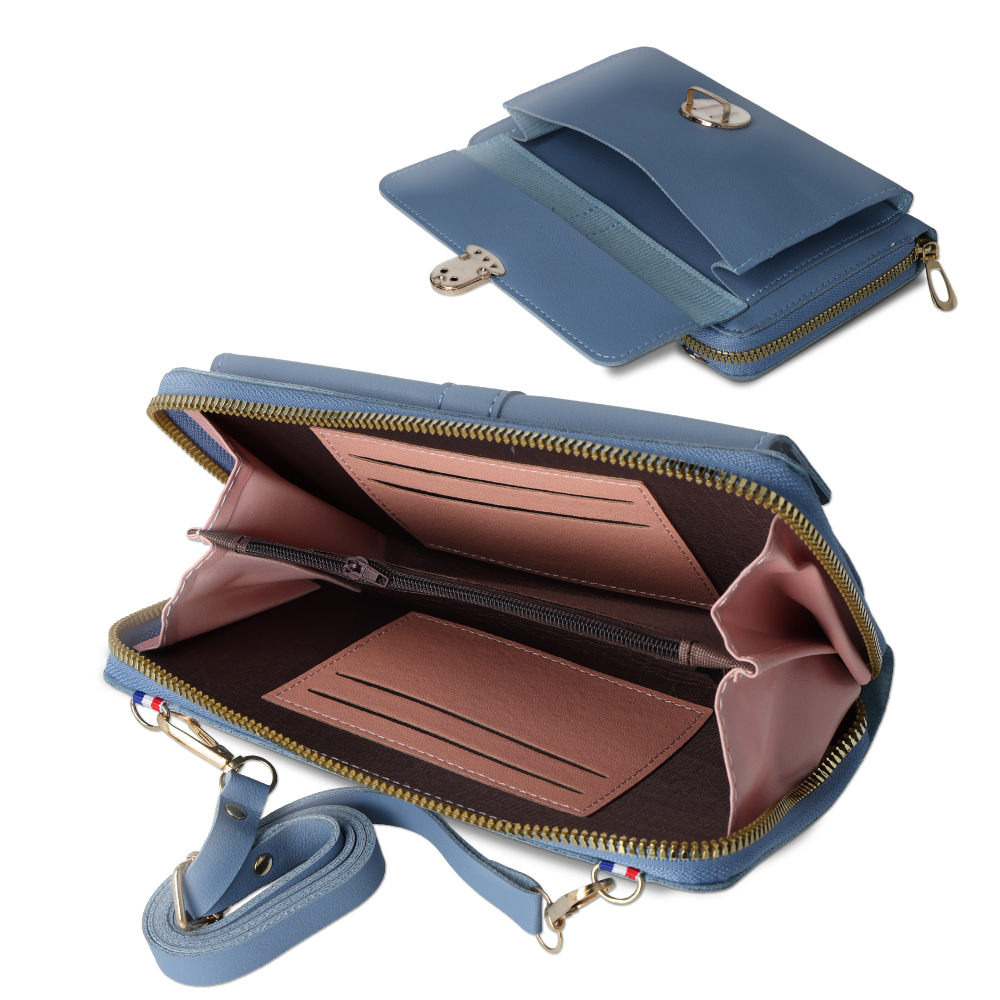 Tato taška se pyšní sofistikovaným designem z kvalitní syntetické kůže v příjemném modrém odstínu. Její hladký povrch a precizní šití dodávají produktu luxusní vzhled. Hlavní úložný prostor je zajištěn robustním zipem, zatímco přední klopa s elegantní kovovou sponou nejen skvěle vypadá, ale také poskytuje rychlý přístup k dalším drobnostem. Taška je doplněna nastavitelným ramenním popruhem, který umožňuje pohodlné nošení přes rameno nebo jako crossbody. Vnitřní uspořádání je promyšlené, s dostatkem místa pro váš telefon a další nezbytnosti.