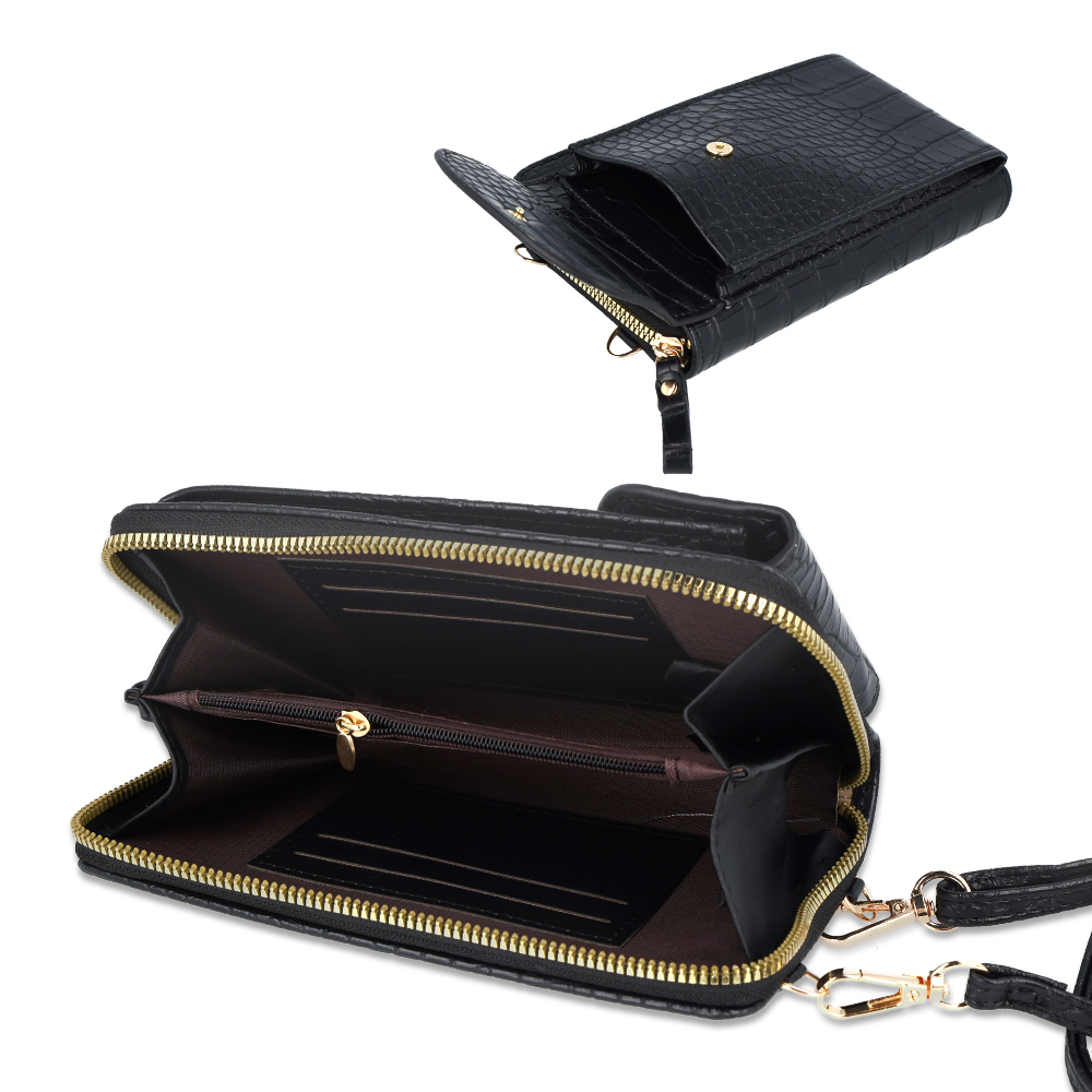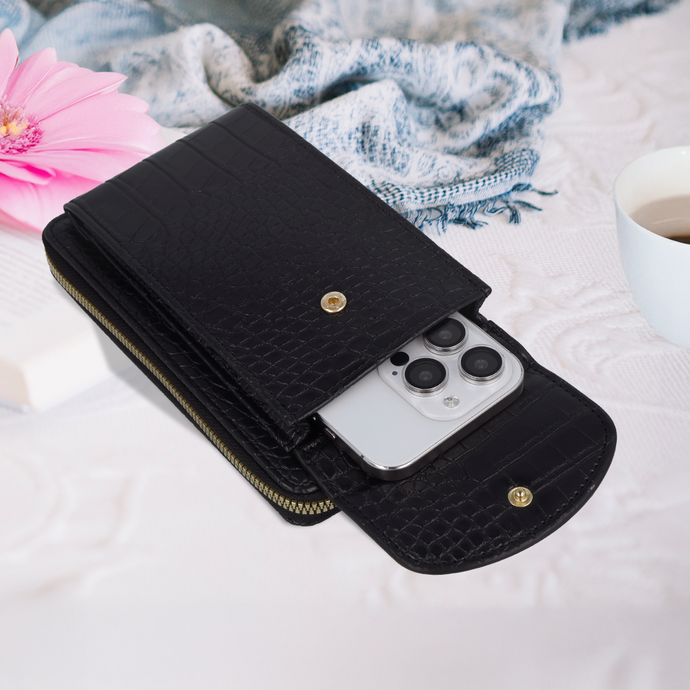 Pouzdro zaujme svým luxusním vzhledem, který je inspirován krokodýlí kůží. Vyrobeno je z kvalitní umělé kůže v klasické černé barvě, což zaručuje jeho univerzálnost a snadnou kombinovatelnost s jakýmkoli outfitem. Detaily v podobě zlatých zipů a kovových prvků dodávají pouzdru sofistikovaný nádech. Díky svému kompaktnímu, ale promyšlenému designu je ideální pro každodenní nošení.