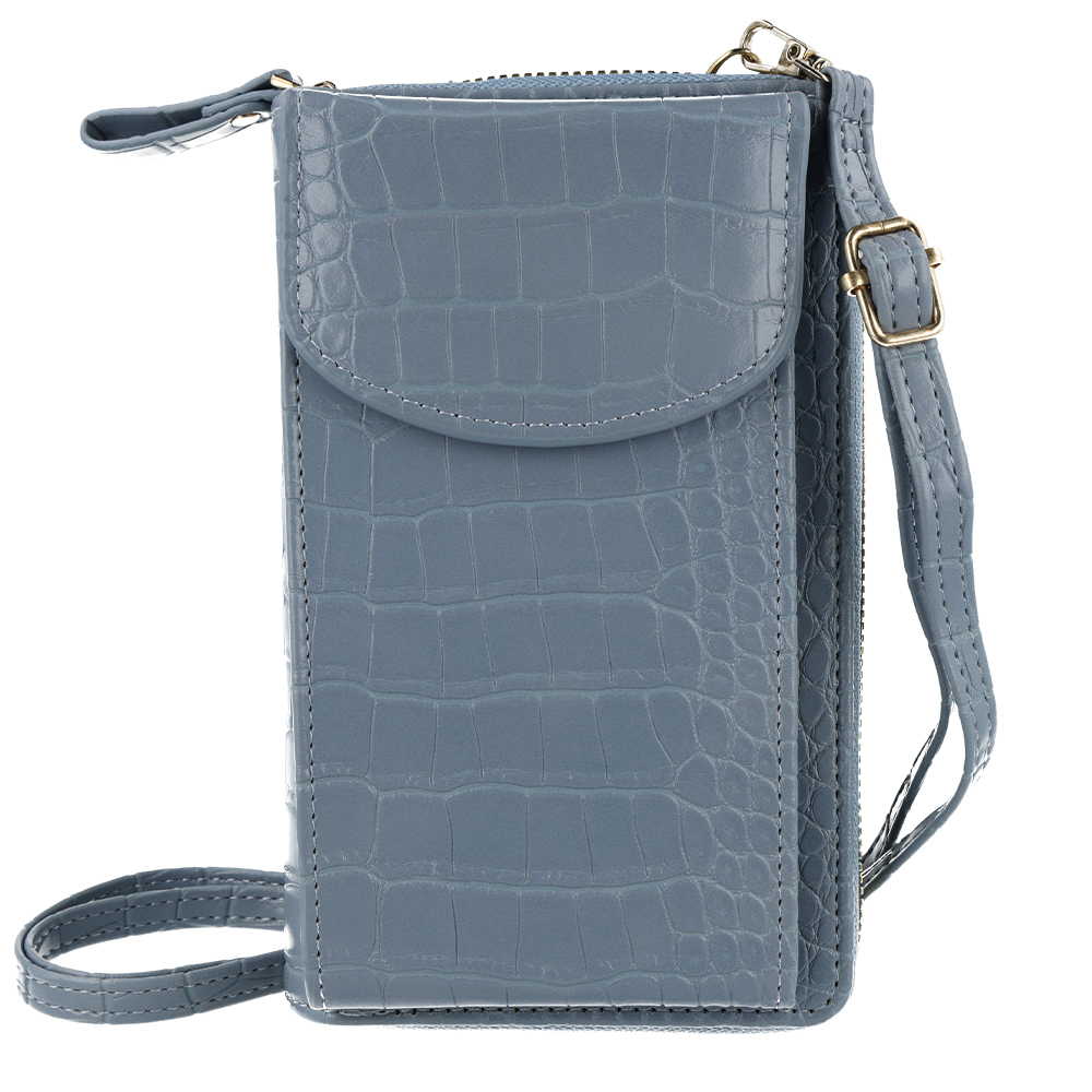 Design tašky GCW12 zaujme na první pohled svou sofistikovanou texturou imitující krokodýlí kůži, která dodává celkovému vzhledu luxusní nádech. Modrá barva je univerzální a snadno kombinovatelná s různými styly oblečení. Taška je vybavena hlavní přihrádkou na telefon, která je zajištěna elegantní klopou s magnetickým zapínáním. Kromě toho nabízí prostornou kapsu na zip, která se otevírá do široka a odhaluje praktické přihrádky na karty a další menší kapsu na zip pro mince nebo klíče. Díky odnímatelnému ramennímu popruhu a praktickému poutku na zápěstí ji můžete nosit přes rameno, jako crossbody nebo jen tak v ruce, což z ní činí mimořádně flexibilní doplněk.