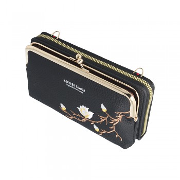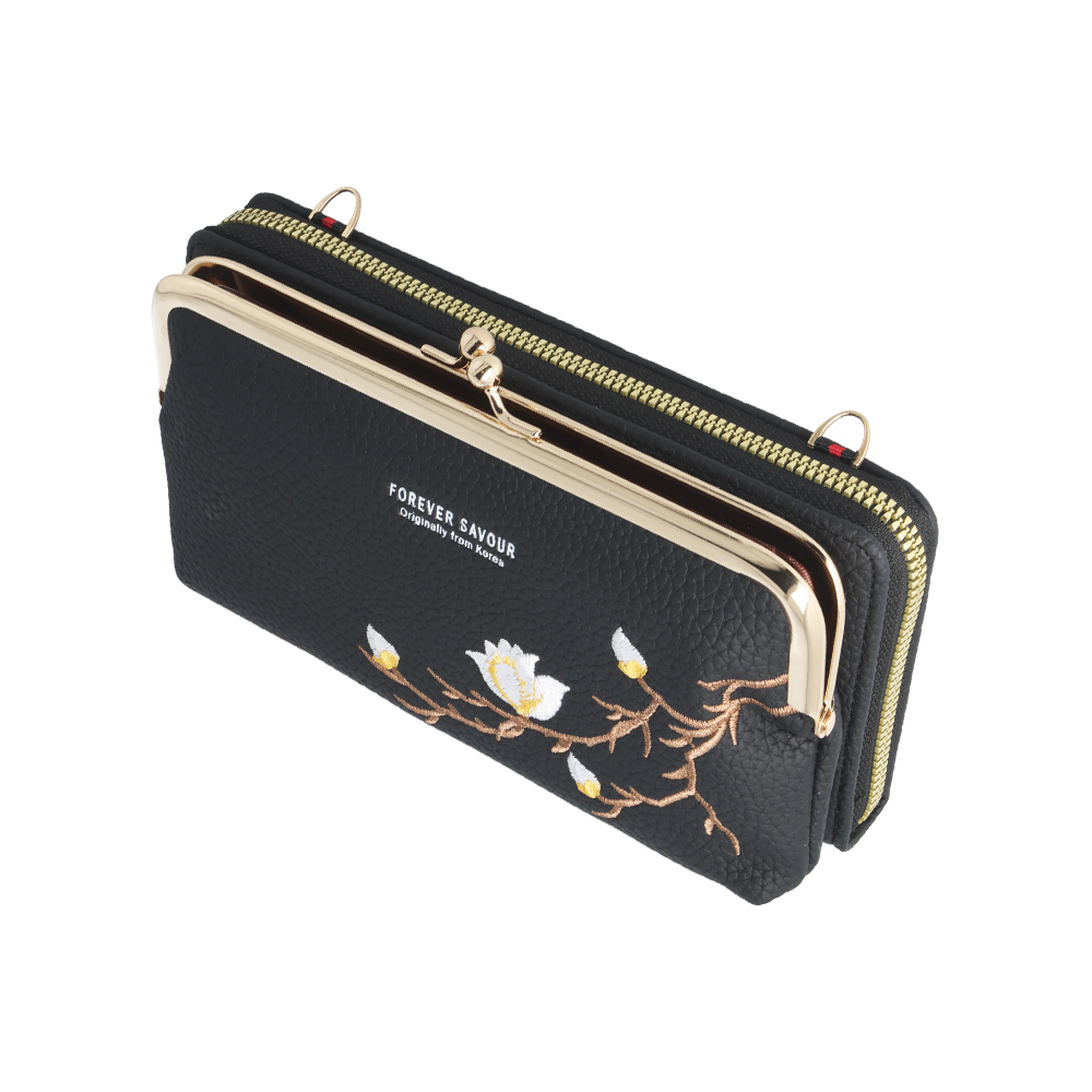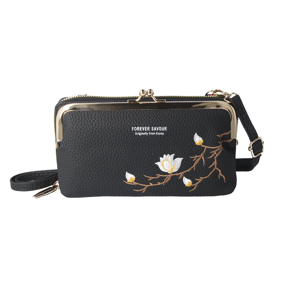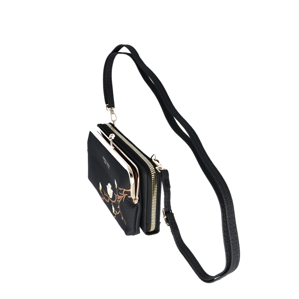 Taška je vyrobena z kvalitního materiálu s jemnou texturou v nadčasové černé barvě. Její design je obohacen o nádhernou květinovou výšivku s bílými květy a hnědými větvičkami, která dodává produktu jedinečný a ženský vzhled. Zlaté kovové detaily, včetně elegantního rámečku s klipem a zipů, podtrhují luxusní dojem. Taška disponuje několika přihrádkami, včetně prostoru pro telefon, karty a hotovost, což z ní činí ideálního společníka pro každodenní nošení. Součástí je také odnímatelný a nastavitelný ramenní popruh pro pohodlné nošení přes rameno nebo jako crossbody.