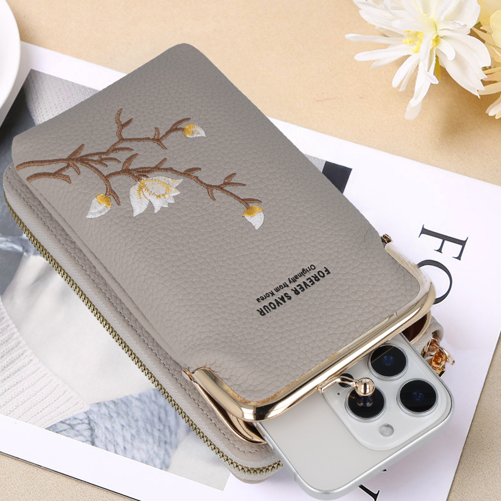 Toto pouzdro je vyrobeno z **kvalitní umělé kůže** s jemnou texturou, která mu dodává luxusní vzhled a příjemný pocit na dotek. Jeho design je obohacen o **nádhernou květinovou výšivku** na přední straně, zobrazující bílé a žluté květy na hnědé větvi, což přidává produktu jedinečný a ženský šarm. **Zlaté kovové detaily**, jako jsou zipy a spony, elegantně doplňují celkový vzhled a podtrhují jeho prémiový charakter.