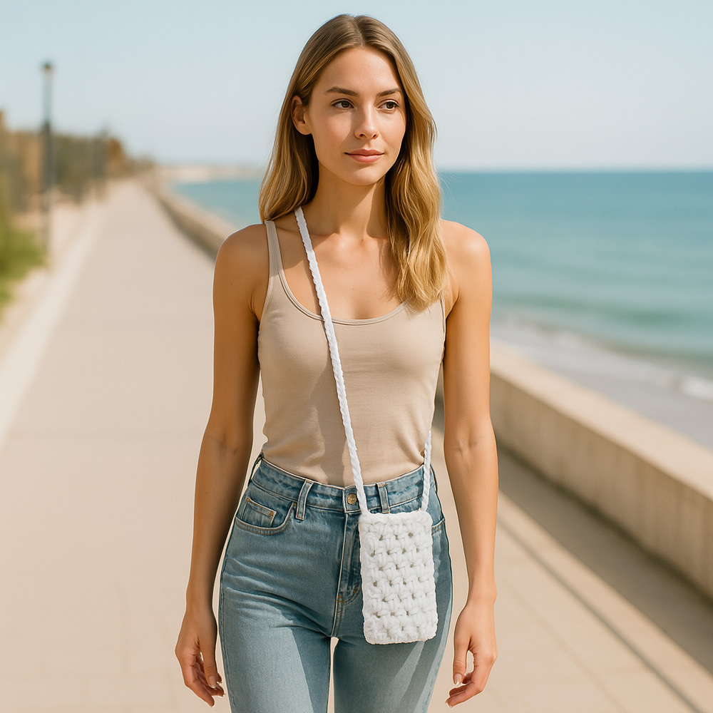 Přidejte šarm svému letnímu vzhledu s touto bílou kabelkou na mobil inspirovanou ruční výrobou a trendy pomalé módy!