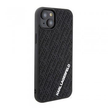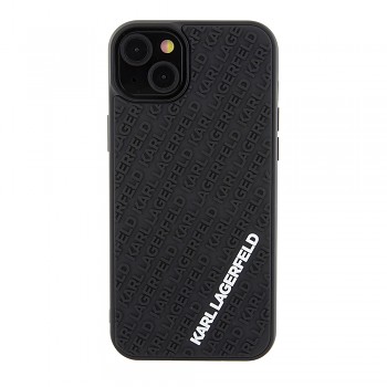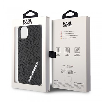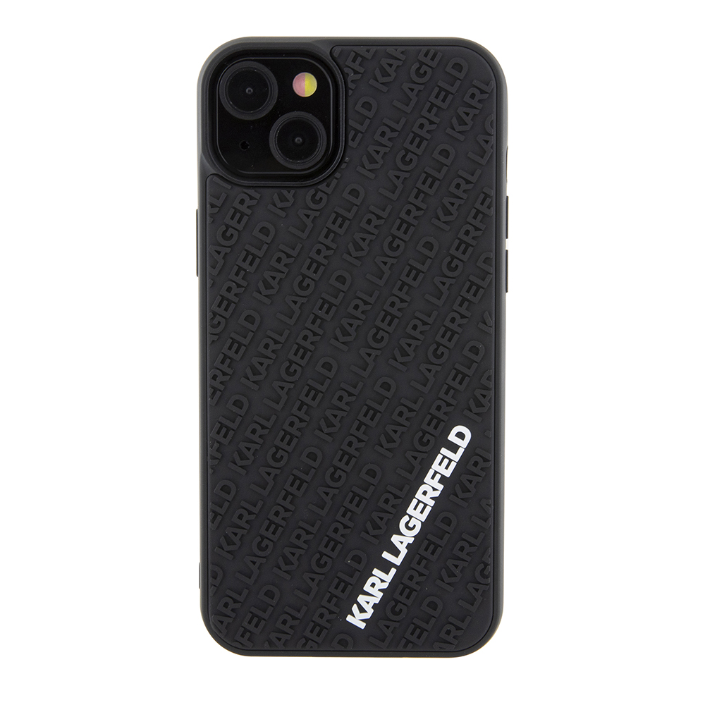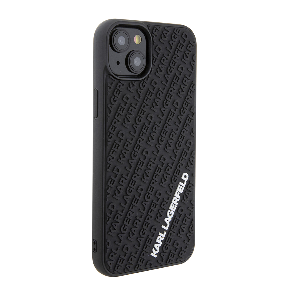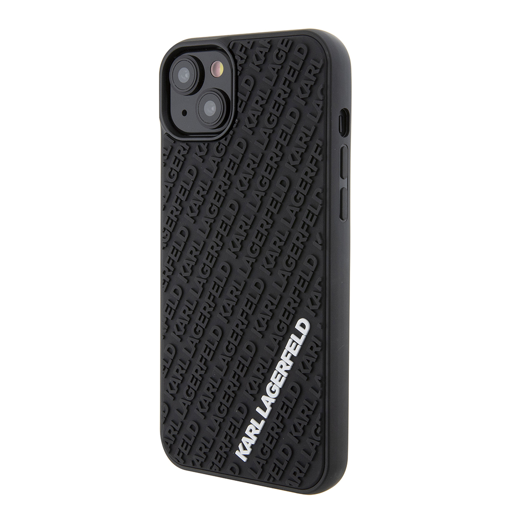 Design krytu je inspirován ikonickým stylem Karla Lagerfelda. Zadní strana je pokryta jemným 3D reliéfním vzorem, který tvoří opakující se nápisy "KARL LAGERFELD" v diagonálních pruzích. Tento sofistikovaný detail dodává krytu jedinečnou texturu a vizuální hloubku. Dominantou je pak výrazné bílé logo "KARL LAGERFELD" umístěné ve spodní části, které okamžitě upoutá pozornost a deklaruje příslušnost k prestižní značce. Kryt je vyroben z odolného a pružného gumového materiálu v elegantní černé barvě, která se snadno kombinuje s jakýmkoli outfitem.