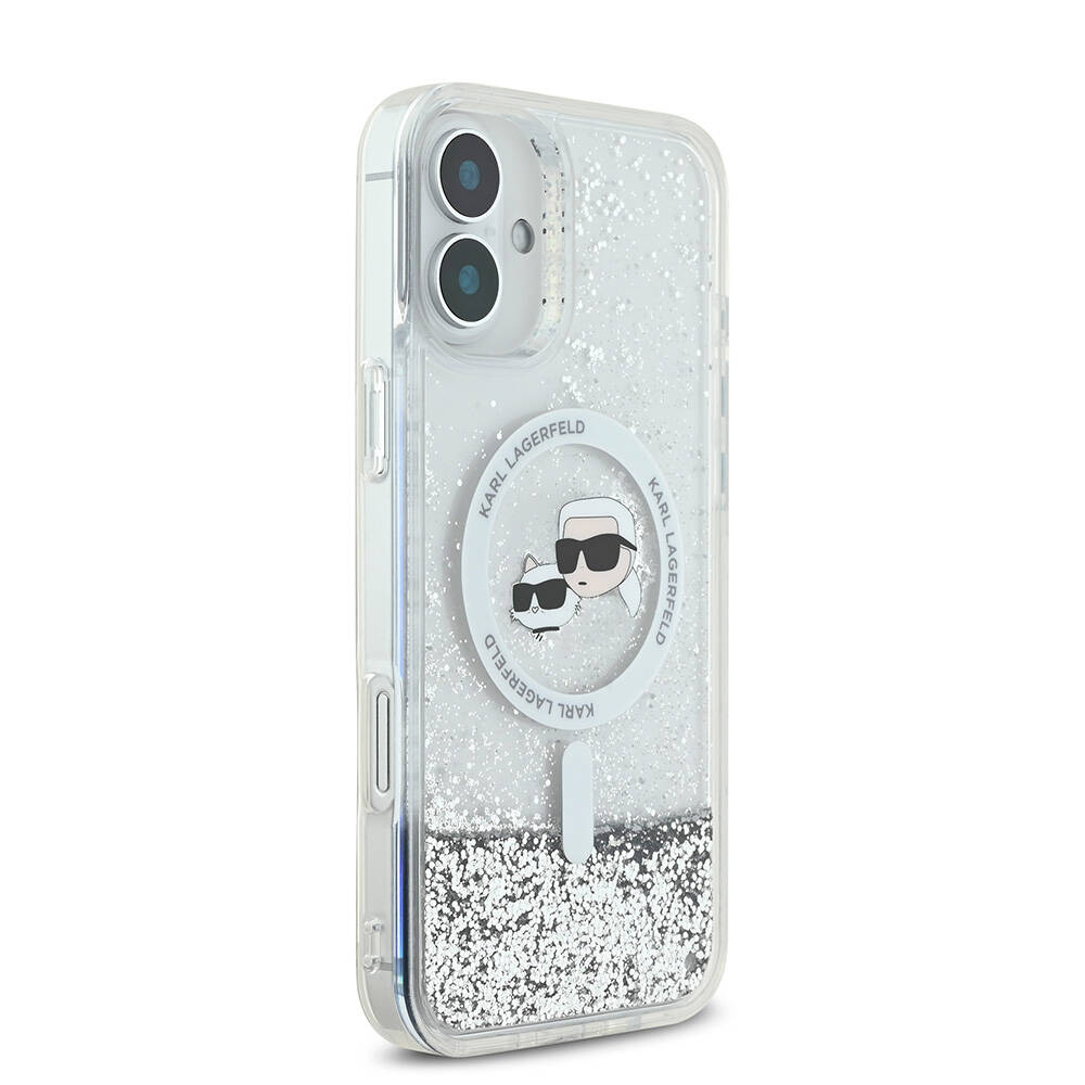 Kryt se pyšní průhledným provedením, které nechává vyniknout barvu a linie vašeho iPhone 16. Uvnitř zadní části krytu se nachází speciální tekutina s miliony stříbrných třpytek, které se při pohybu telefonu dynamicky přesýpají a vytvářejí fascinující vizuální efekt. Centrálním prvkem designu je ikonické zobrazení hlavy Karla Lagerfelda a jeho milované kočky Choupette, které je elegantně integrováno do bílého kruhu kompatibilního s technologií MagSafe. Tento kruh zajišťuje perfektní přilnavost a funkčnost veškerého MagSafe příslušenství. Kryt je vyroben z odolného a pružného materiálu, který chrání telefon před poškrábáním, nárazy a nečistotami, zatímco přesné výřezy zaručují snadný přístup ke všem tlačítkům a portům.