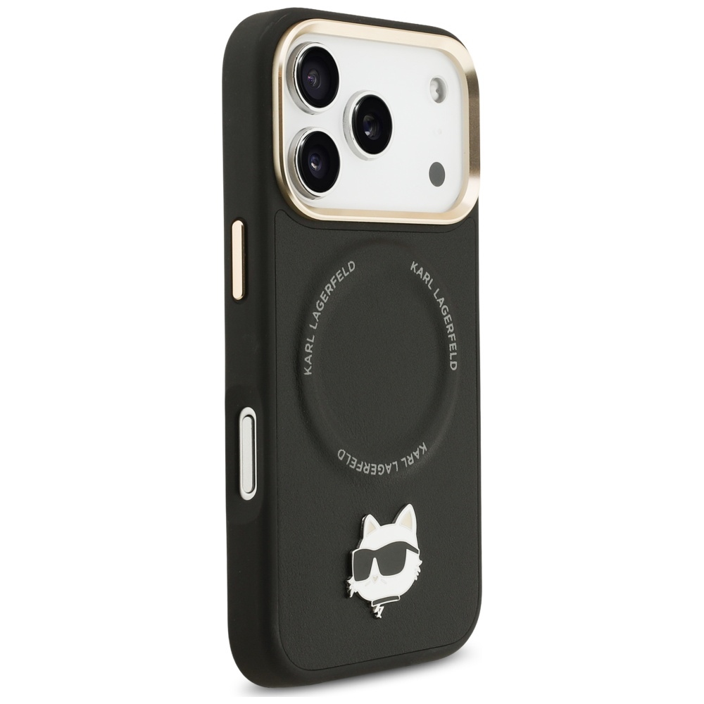Kryt se pyšní elegantním **černým provedením** s matným povrchem, který je příjemný na dotek a minimalizuje otisky prstů. Dominantním prvkem na zadní straně je **kovové logo Karla Lagerfelda** v podobě jeho ikonické kočky Choupette s brýlemi, které dodává krytu punc luxusu a originality. Okolo loga je decentně vyraženo jméno značky "KARL LAGERFELD", což podtrhuje jeho autenticitu. Zlaté detaily kolem výřezu pro fotoaparát a na tlačítkách dodávají krytu sofistikovaný vzhled.