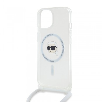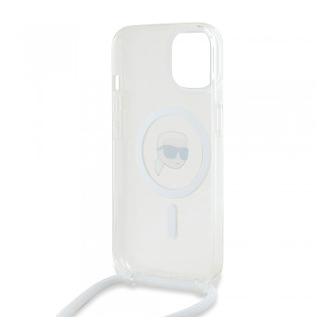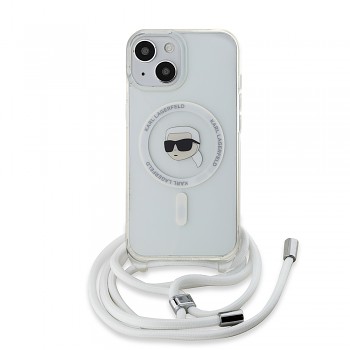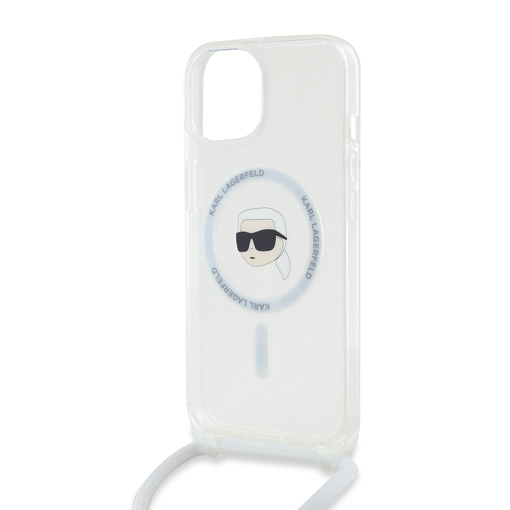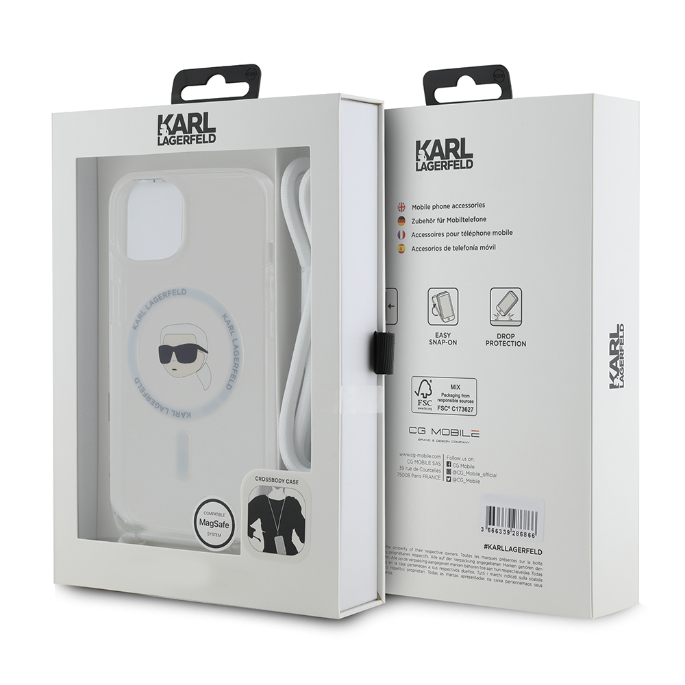 Kryt se pyšní transparentním provedením, které nechá vyniknout originální design vašeho telefonu. Dominantním prvkem je ikonická silueta hlavy Karla Lagerfelda s brýlemi, elegantně zakomponovaná do kruhu MagSafe na zadní straně krytu. Tento detail dodává krytu punc originality a okamžitě jej odlišuje. Součástí balení je také praktický crossbody popruh v bílé barvě s elegantními kovovými detaily, který umožňuje pohodlné nošení telefonu přes rameno nebo kolem krku, a uvolňuje tak vaše ruce. Popruh je nastavitelný, což zajišťuje maximální komfort. I přes to, že název produktu zmiňuje "hnědá", vizuální provedení krytu je transparentní s bílým popruhem, což podtrhuje jeho moderní a čistý vzhled.