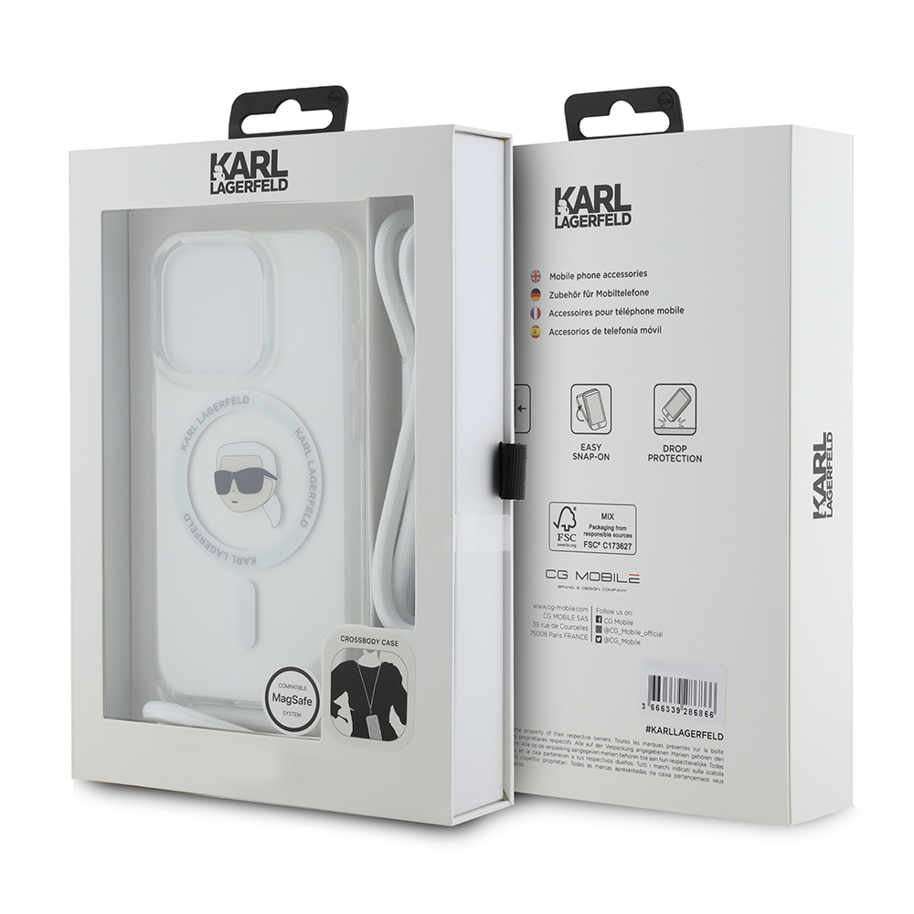 Kryt se pyšní průhledným provedením, které nechá vyniknout originální design vašeho telefonu. Dominantním prvkem je stylizovaná hlava Karla Lagerfelda s charakteristickými slunečními brýlemi, elegantně umístěná uprostřed zadní strany krytu. Okolo motivu se decentně vine nápis KARL LAGERFELD, což dodává produktu punc originality a luxusu. Materiál krytu je navržen tak, aby poskytoval vysokou odolnost proti pádům, poškrábání a dalším každodenním nástrahám, zatímco zůstává příjemný na dotek. Integrovaný MagSafe kroužek zajišťuje bezproblémovou kompatibilitu s veškerým MagSafe příslušenstvím, od bezdrátových nabíječek po peněženky. Součástí balení je také elegantní crossbody popruh v bílé barvě, který umožňuje nosit telefon pohodlně přes rameno nebo kolem krku, a mít tak ruce volné. Popruh je nastavitelný a zakončený kovovými detaily, které podtrhují celkový luxusní vzhled.