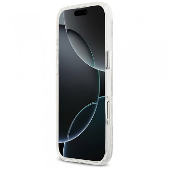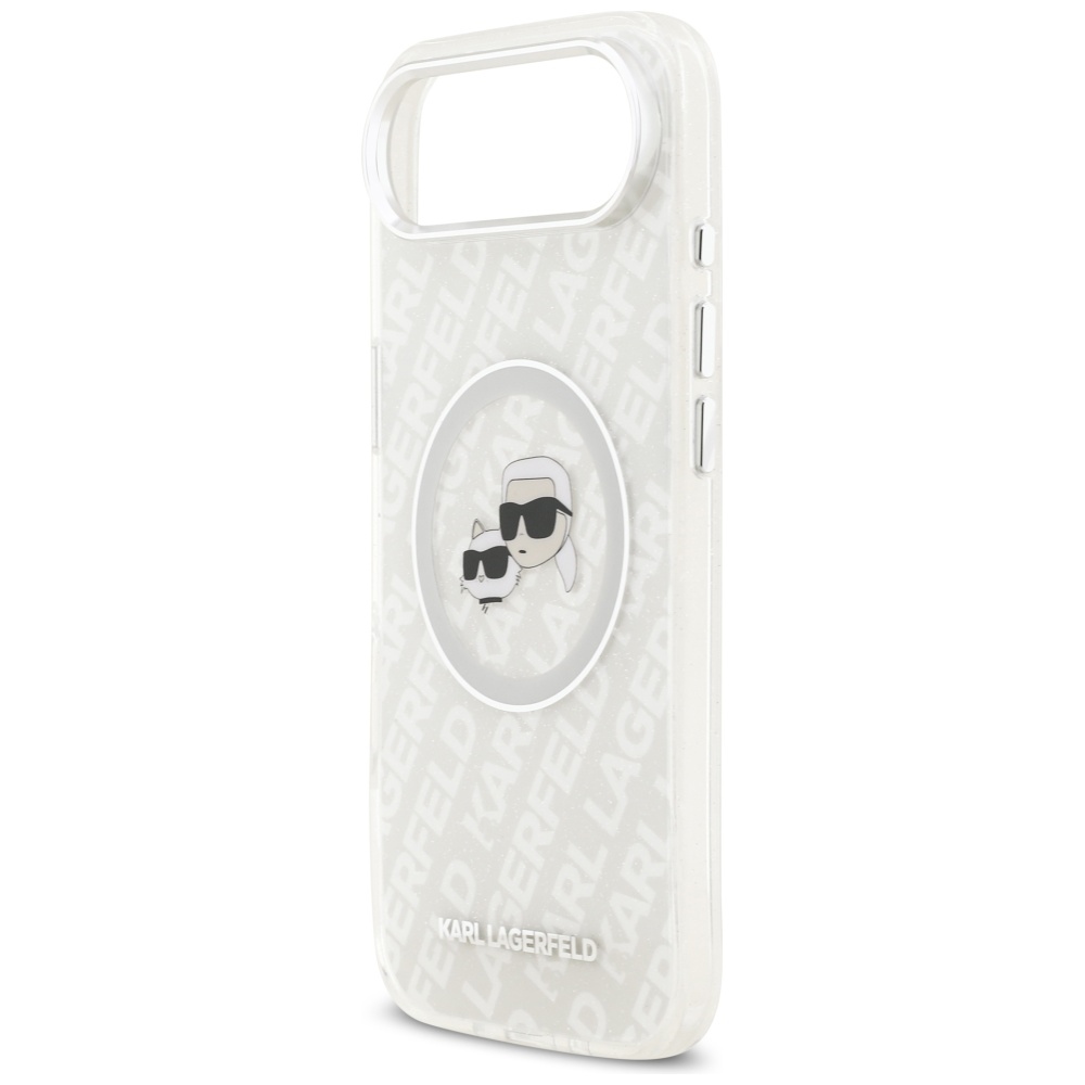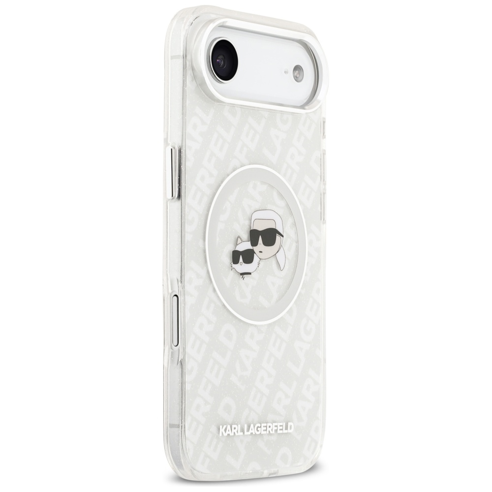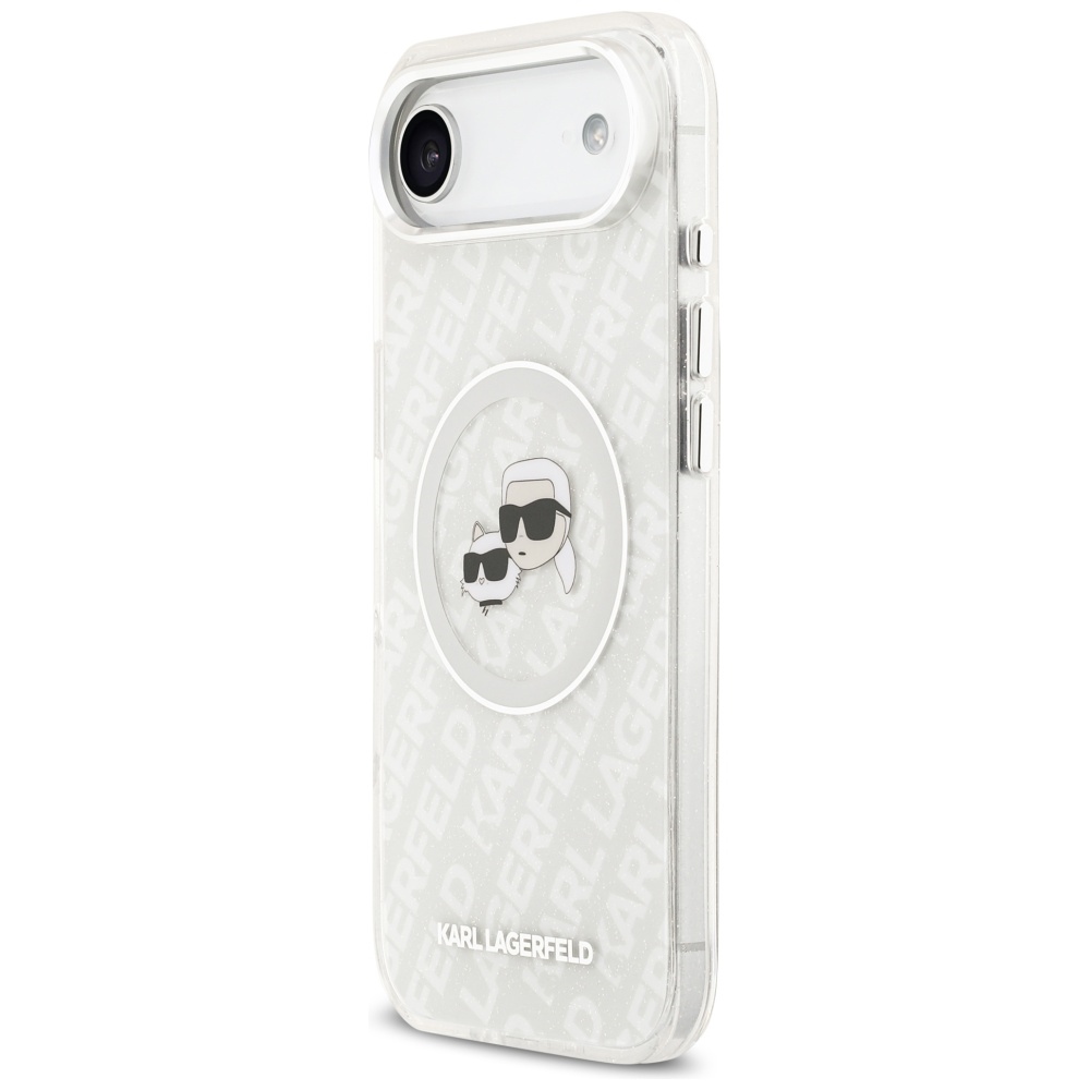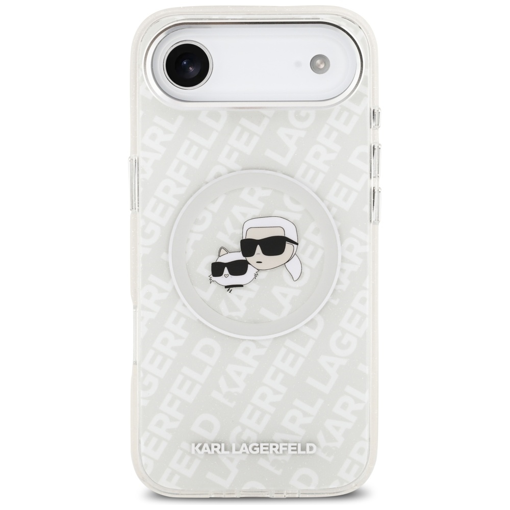 Kryt se pyšní průsvitným šedým provedením, které je obohaceno o jemné, třpytivé částečky, dodávající mu sofistikovaný lesk. Na zadní straně dominuje ikonické logo s hlavami Karla Lagerfelda a jeho milované kočky Choupette, které je elegantně zasazeno do kruhového prvku kompatibilního s MagSafe. Celý povrch je navíc decentně zdoben opakujícím se nápisem "KARL LAGERFELD", což podtrhuje originalitu a prestiž značky. Vyroben z odolného a flexibilního materiálu, který se snadno nasazuje i sundává, a zároveň poskytuje pevný úchop a ochranu.