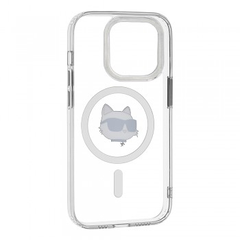 Kryt se pyšní ikonickým motivem Choupette's Head, milované kočky Karla Lagerfelda, která je zde vyobrazena s charakteristickými slunečními brýlemi. Tento hravý, avšak sofistikovaný design je zasazen do elegantního bílého metalického kruhu, který zároveň slouží jako integrovaný prvek pro technologii MagSafe. Samotný kryt je průhledný, což nechává vyniknout originální barvu vašeho telefonu, zatímco metalické detaily dodávají luxusní nádech.