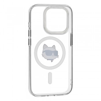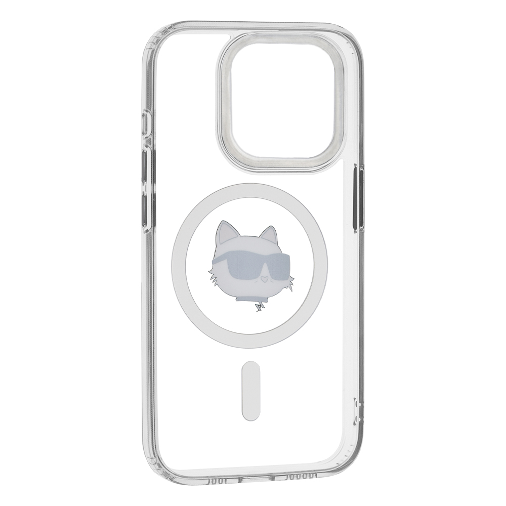 Kryt se pyšní průhledným provedením s nádechem bílé metalické barvy na zadní straně, která dodává luxusní vzhled. Dominantním prvkem je ikonická hlava kočky Choupette, múzy Karla Lagerfelda, vyvedená ve stylových slunečních brýlích. Tento motiv je elegantně umístěn uprostřed zadní strany krytu. Okolo motivu Choupette je integrován MagSafe kroužek, který zajišťuje perfektní kompatibilitu s MagSafe příslušenstvím a bezdrátovým nabíjením. Nápis "KARL LAGERFELD" decentně obepíná MagSafe kroužek, což podtrhuje autentičnost a prestiž značky. Kryt je navržen tak, aby poskytoval spolehlivou ochranu proti poškrábání, nárazům a pádům, zatímco si zachovává štíhlý profil a snadný přístup ke všem portům a tlačítkům.
