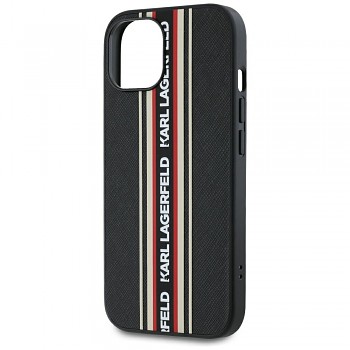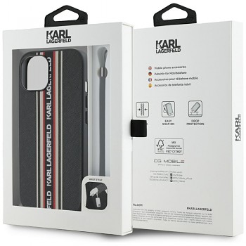 Kryt se pyšní elegantním černým provedením s charakteristickou Saffiano texturou, která je příjemná na dotek a zároveň odolná proti poškrábání a drobným oděrkám. Dominantním prvkem designu je vertikální pruh v kombinaci černé, červené a bílé barvy, který prochází středem zadní strany krytu. V černém segmentu pruhu je opakovaně vyvedeno ikonické logo KARL LAGERFELD, což dodává krytu punc luxusu a originality. Součástí krytu je také praktická černá šňůrka, která umožňuje pohodlné nošení telefonu na zápěstí a minimalizuje riziko pádu. Přesné výřezy zajišťují snadný přístup ke všem tlačítkům a konektorům, aniž by bylo nutné telefon z krytu vyjímat.