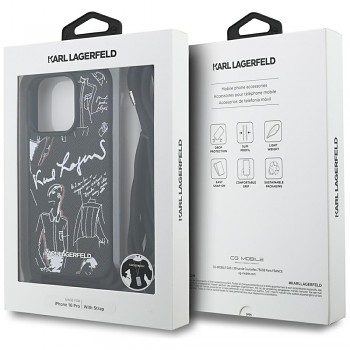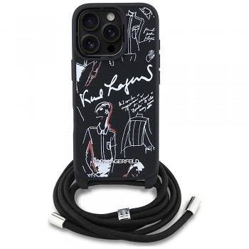 Pouzdro je vyrobeno z vysoce kvalitního materiálu s Saffiano texturou, která je známá svou odolností proti poškrábání a luxusním vzhledem. Dominantou designu je černý podklad zdobený ikonickými skicami v bílé a červené barvě, které evokují módní ilustrace a rukopis samotného Karla Lagerfelda. Na zadní straně je decentně umístěno logo KARL LAGERFELD. Součástí pouzdra je odnímatelný černý crossbody popruh z pevného pleteného materiálu, doplněný elegantními stříbrnými kovovými detaily a posuvníkem s nápisem "KARL", který umožňuje pohodlné nošení telefonu přes rameno nebo kolem krku.