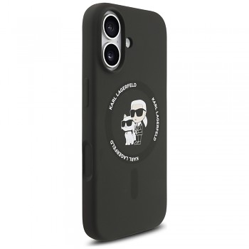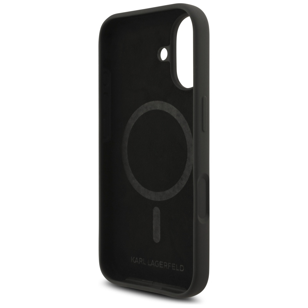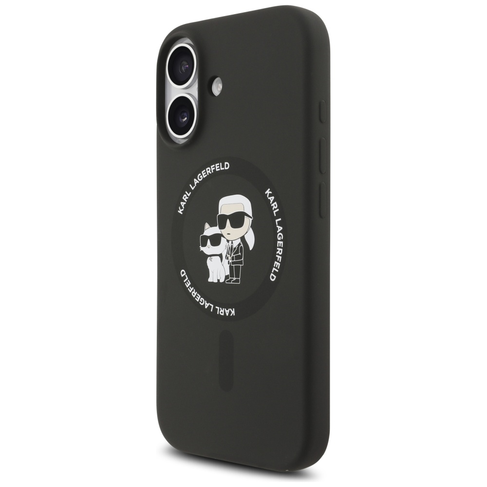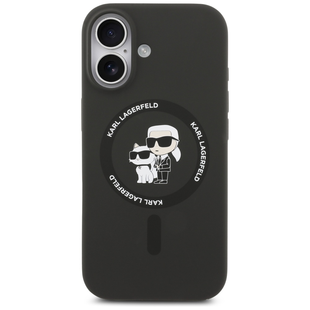 Pouzdro je vyrobeno z vysoce kvalitního silikonu, který je příjemný na dotek a zajišťuje pevný úchop, čímž minimalizuje riziko vyklouznutí telefonu z ruky. Jeho matný černý povrch působí sofistikovaně a nadčasově. Na zadní straně pouzdra dominuje ikonický motiv Karla Lagerfelda s jeho věrnou kočkou Choupette, umístěný v kruhovém designu, který zároveň naznačuje přítomnost integrované technologie MagSafe. Tento kruhový prvek je nejen stylovým detailem, ale také funkčním doplňkem pro snadné a bezpečné přichycení MagSafe příslušenství. Pouzdro je precizně zpracované s přesnými výřezy pro všechny porty a tlačítka, což zajišťuje plnou funkčnost telefonu bez nutnosti pouzdro sundávat. Zvýšené okraje kolem displeje a fotoaparátu poskytují dodatečnou ochranu proti poškrábání a nárazům.