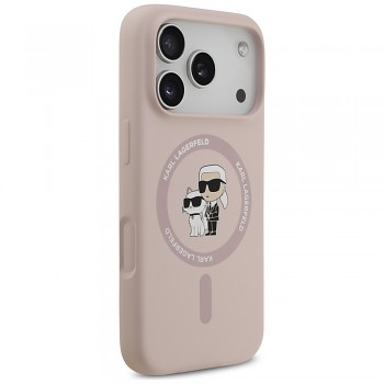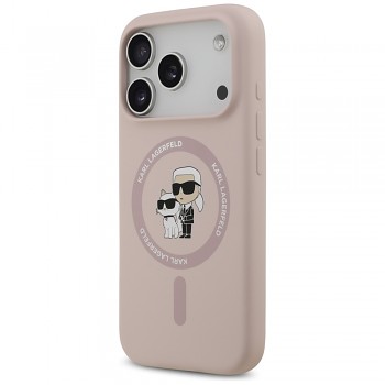 Pouzdro je vyrobeno z prémiového silikonu, který je příjemný na dotek a zajišťuje pevný úchop, čímž minimalizuje riziko vyklouznutí telefonu z ruky. Jeho matný povrch v odstínu pudrové růže působí sofistikovaně a moderně. Dominantním prvkem zadní strany je integrovaný MagSafe kroužek, který zajišťuje bezproblémovou kompatibilitu s MagSafe příslušenstvím a rychlé bezdrátové nabíjení. Uvnitř kroužku se nachází hravá, avšak elegantní ilustrace Karla Lagerfelda a jeho milované kočky Choupette, oba v ikonických slunečních brýlích. Kolem ilustrace je decentně umístěn nápis "KARL LAGERFELD". Pouzdro disponuje přesnými výřezy pro fotoaparát, porty a tlačítka, což zaručuje plnou funkčnost telefonu bez nutnosti pouzdro sundávat. Oblast kolem fotoaparátu je navíc zvýrazněna světlejším, téměř béžovým odstínem, což dodává pouzdru další rozměr.