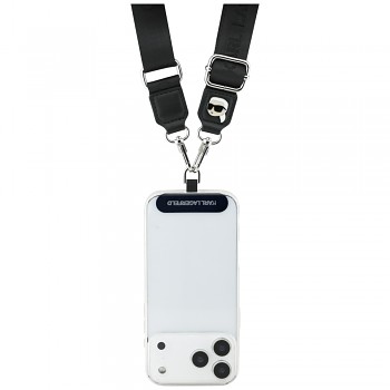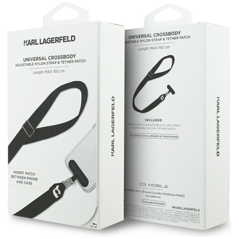 Tento popruh se pyšní sofistikovaným designem v klasické černé barvě, která podtrhuje jeho univerzálnost a eleganci. Je vyroben z odolného nylonu, který zajišťuje dlouhou životnost a příjemný pocit při nošení. Na popruhu je decentně, ale výrazně opakovaně vyveden nápis "KARL LAGERFELD", což dodává produktu punc luxusu a originality.
