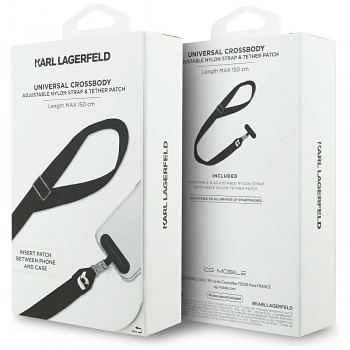 Součástí balení je i praktická podložka (tether patch) s logem Karl Lagerfeld, která se jednoduše vloží mezi telefon a ochranný kryt. Malé očko podložky pak vyčnívá z otvoru pro nabíjení, což umožňuje snadné a bezpečné připojení popruhu. Toto řešení je univerzální a kompatibilní se všemi značkami smartphonů, které používají ochranný kryt.