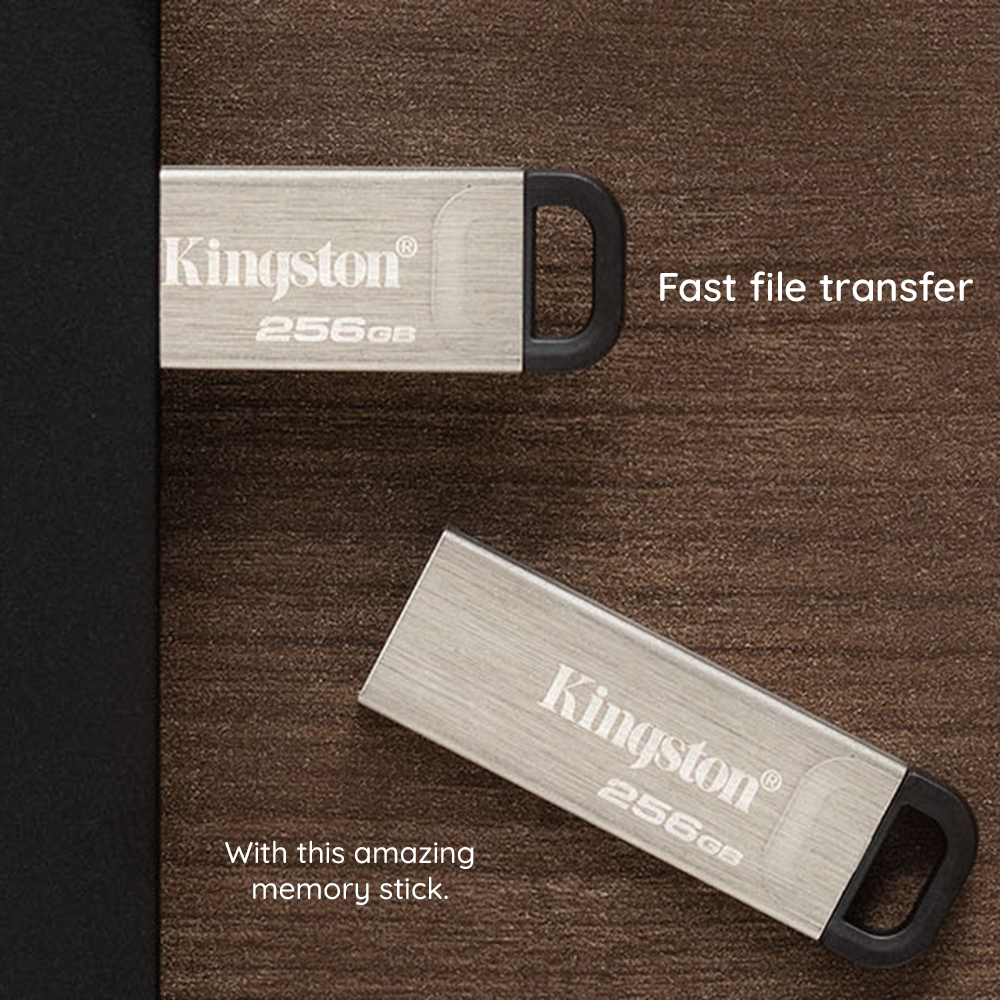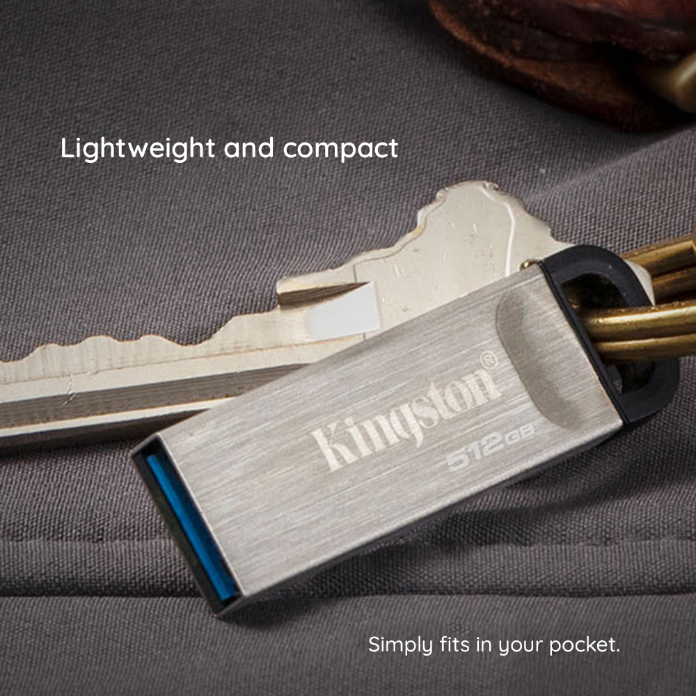 Flash disk Kingston DT Kyson se pyšní minimalistickým a moderním designem. Jeho tělo je vyrobeno z odolného kovu ve stříbrné barvě s jemnou kartáčovanou texturou, která mu dodává prémiový vzhled a zároveň zvyšuje odolnost proti poškrábání. Kompaktní rozměry a nízká hmotnost zajišťují, že se disk snadno vejde do kapsy nebo na klíčenku, k čemuž slouží praktické černé očko na konci disku. Modrý vnitřek konektoru USB-A signalizuje podporu rychlého rozhraní USB 3.2.