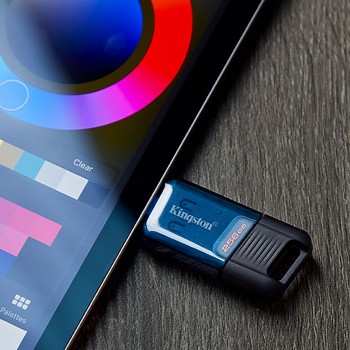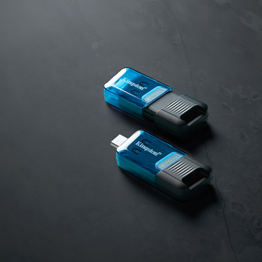 Design flash disku Kingston DT80M kombinuje funkčnost s moderním vzhledem. Tělo je provedeno v elegantní černé barvě s texturovaným povrchem, který zajišťuje pevný úchop. Průsvitná modrá část dodává disku osobitý styl a zároveň chrání konektor. Díky integrovanému poutku jej snadno připevníte ke klíčům nebo batohu, což z něj činí ideálního společníka na cesty.