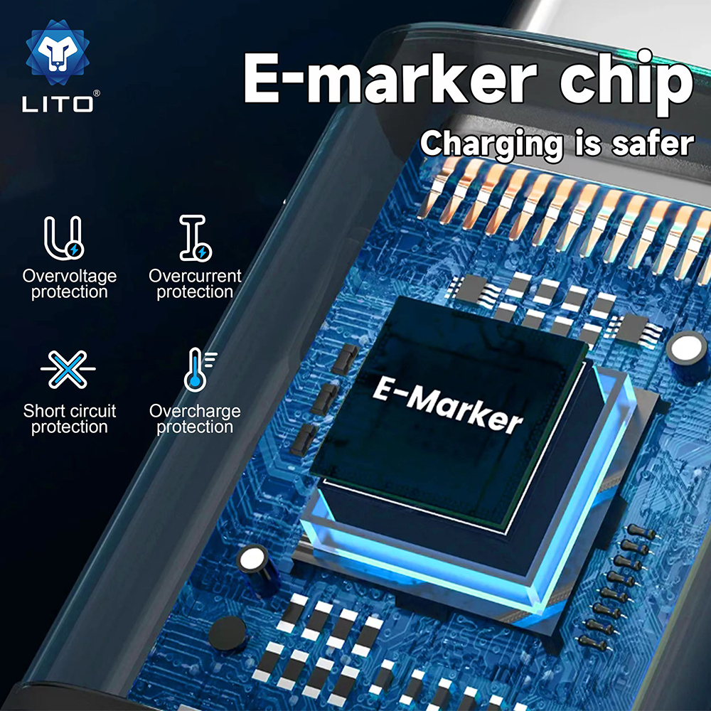 Pro vaši maximální bezpečnost je kabel Lito LD09CC vybaven vestavěným čipem E-Marker. Tento inteligentní čip zajišťuje stabilní a bezpečné nabíjení a poskytuje komplexní ochranu proti přepětí, nadproudu, zkratu a přebití. Můžete si být jisti, že vaše zařízení jsou v bezpečí.
