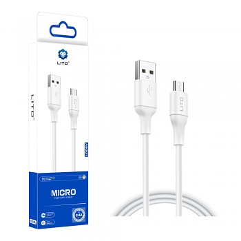 Design kabelu je minimalistický a elegantní. Oba konektory, standardní USB-A a Micro-USB, jsou v bílé barvě a disponují zesílenou ochranou proti ohybu v místě spoje s kabelem. Tato ochrana výrazně prodlužuje životnost kabelu a minimalizuje riziko poškození při častém používání. Na Micro-USB konektoru je decentně umístěno logo LITO, které podtrhuje jeho značkovou kvalitu. Kabel podporuje proud až 2.4A, což umožňuje rychlé a efektivní nabíjení kompatibilních zařízení.