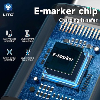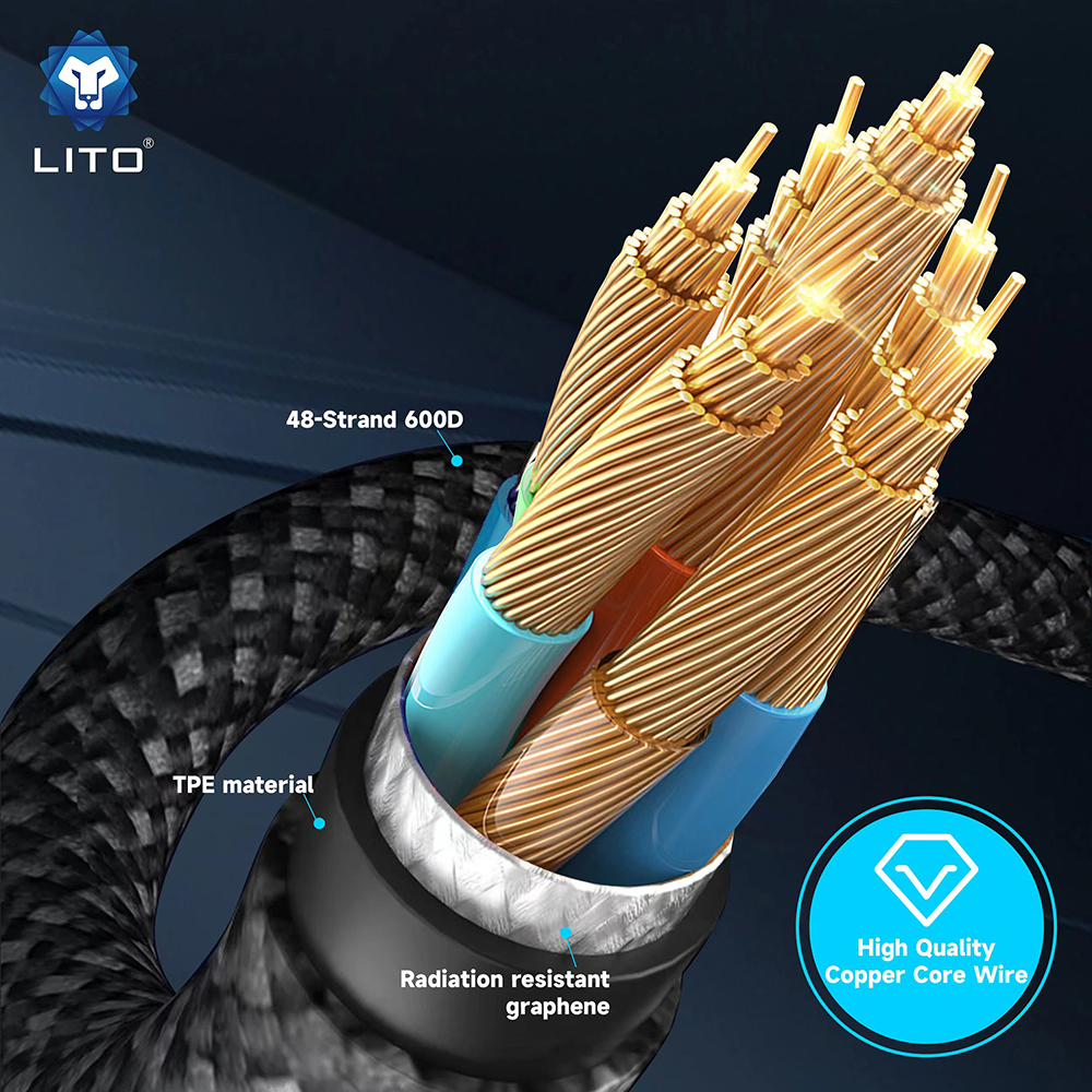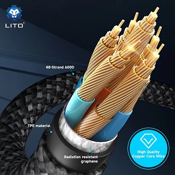 Design kabelu Lito LD09CL je promyšlený do posledního detailu. Kabel je vyveden v elegantní černé barvě a disponuje odolným opletením, které výrazně prodlužuje jeho životnost a zabraňuje zamotávání. Konektory jsou opatřeny robustními kovovými kryty ve stříbrném odstínu, které nejen skvěle vypadají, ale také chrání vnitřní komponenty. Zvláště poutavý je průhledný segment na Lightning konektoru, pod kterým se nachází již zmíněný LED displej. Na kovovém krytu Type-C konektoru je decentně umístěno logo značky Lito, podtrhující kvalitu a originalitu produktu.