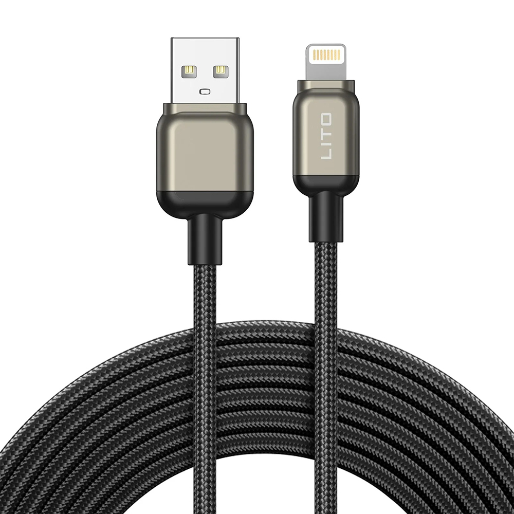 Kabel Lito LD17 se pyšní prémiovým zpracováním, které kombinuje funkčnost s estetikou. Jeho tělo je potaženo odolným pleteným nylonem v černé barvě, což zajišťuje výjimečnou pevnost a ochranu proti zamotání a mechanickému poškození. Kovové koncovky konektorů v elegantním odstínu, pravděpodobně tmavě šedé nebo šampaňské, dodávají kabelu luxusní vzhled a zároveň zvyšují jeho životnost. Na Lightning konektoru je decentně umístěno logo značky LITO, které podtrhuje jeho originalitu a kvalitu. Díky zesíleným spojům mezi kabelem a konektory je minimalizováno riziko prasknutí, což prodlužuje celkovou životnost produktu.