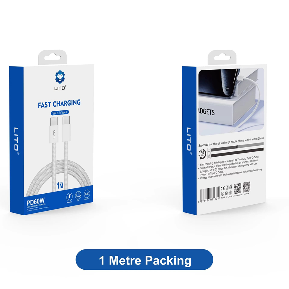 Kabel Lito LD04CC se pyšní prémiovým designem, který kombinuje estetiku s funkčností. Jeho povrch je tvořen odolným textilním opletením v bílé barvě, což nejenže dodává kabelu sofistikovaný vzhled, ale zároveň výrazně zvyšuje jeho životnost a odolnost proti zamotání a mechanickému poškození. Koncovky USB-C jsou rovněž v bílém provedení s elegantními kovovými detaily, které zajišťují pevné a stabilní připojení. Na jedné z koncovek je decentně umístěno logo značky Lito, podtrhující kvalitu a originalitu produktu.
