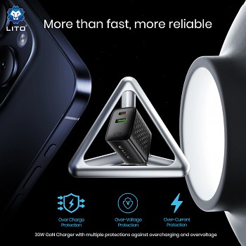 Lito Wall Charger LC19T s kabelem Type-C Type-C USB výstup PD30W GaN EU černáPředstavujeme Lito nástěnnou nabíječku LC19T, která je ztělesněním moderní technologie a elegantního designu. Tato nabíječka v černém provedení je navržena pro maximální efektivitu a spolehlivost, a to vše v kompaktním balení. Díky technologii GaN (nitrid gallia) nabízí mimořádně rychlé nabíjení s výkonem až 30W, přičemž si zachovává menší rozměry a nižší zahřívání oproti tradičním nabíječkám.