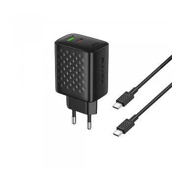 Nabíječka Lito LC24T se pyšní **elegantním a moderním designem** v **černé barvě**. Její **kompaktní rozměry** a **nízká hmotnost** ji činí **ideálním společníkem na cesty** i pro **každodenní použití**. Povrch nabíječky je na bocích opatřen **jemnou texturou** s geometrickým vzorem, která nejenže dodává zařízení **sofistikovaný vzhled**, ale také zajišťuje **lepší úchop**. Na horní straně naleznete **dva výstupní porty**: jeden **USB-C** s výrazným zeleným vnitřkem a jeden **USB-A** s oranžovým vnitřkem, což umožňuje **současné nabíjení více zařízení**. Kabel Type-C na Type-C je rovněž v **černé barvě** a jeho konektory jsou **robustně provedené** pro **maximální odolnost** a **dlouhou životnost**.