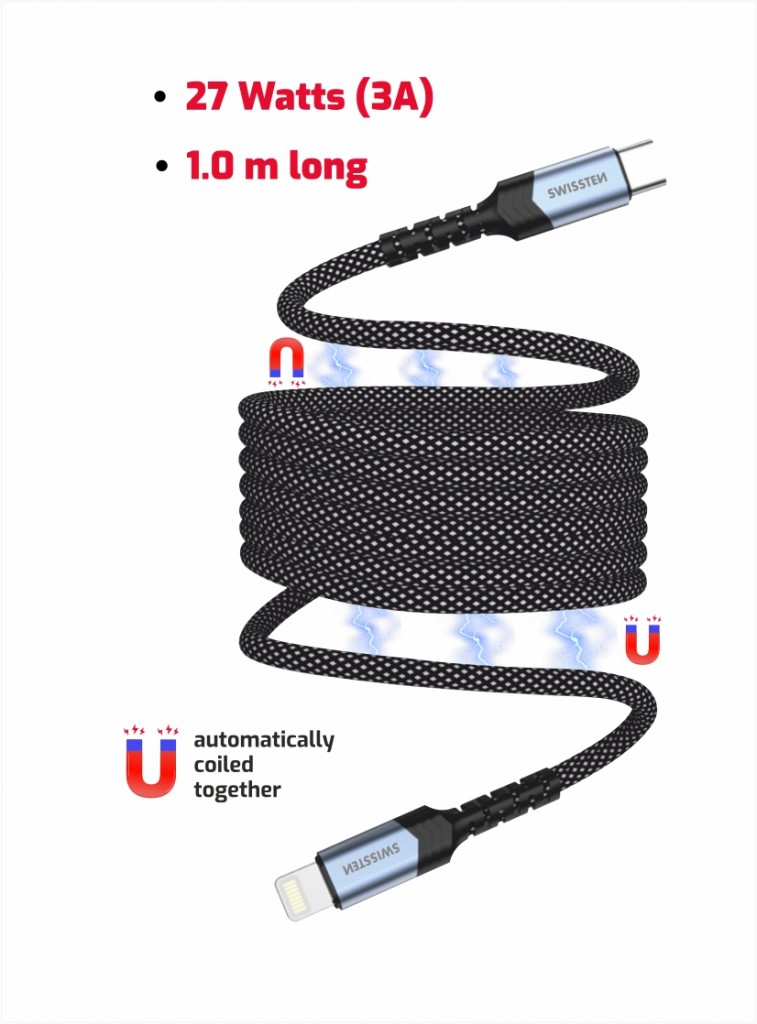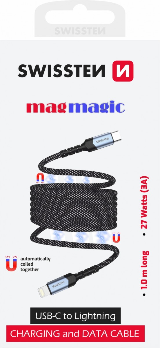 Magnetický datový kabel Swissten samonavíjecí USB-C - Lightning 1 mHledáte kabel, který vám usnadní život a zároveň vypadá stylově? Představujeme vám magnetický samonavíjecí datový kabel Swissten s koncovkou Lightning, který je nejen praktický, ale také elegantní. Tento kabel o délce 1 metr je ideálním společníkem pro každodenní nabíjení a přenos dat, a to bez zbytečného nepořádku!