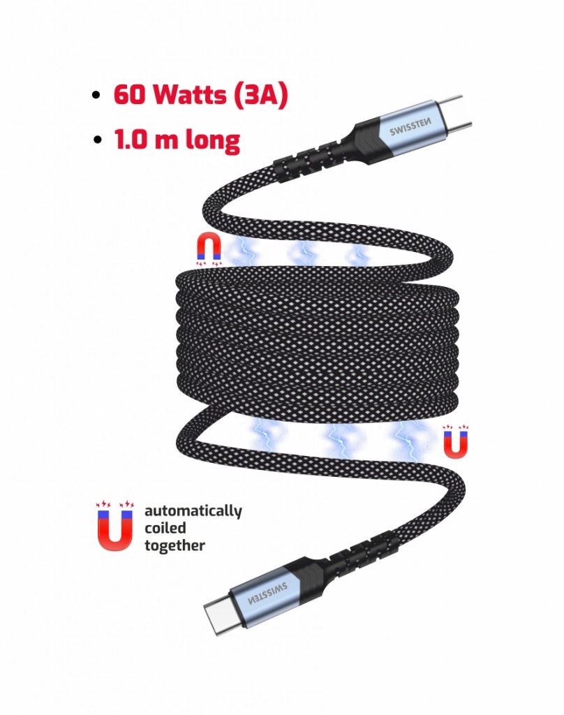 Magnetický datový kabel Swissten samonavíjecí USB-C - USB-C 1 mHledáte kabel pro nabíjení s koncovkou USB-C, který nezabírá žádné místo, ale zároveň je dlouhý 1 metr? Našli jste správně! Magnetický samonavíjecí kabel Swissten s datovým přenosem splní veškeré vaše přání a uspoří vám, oproti věžným kabelům, spoustu místa.