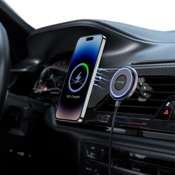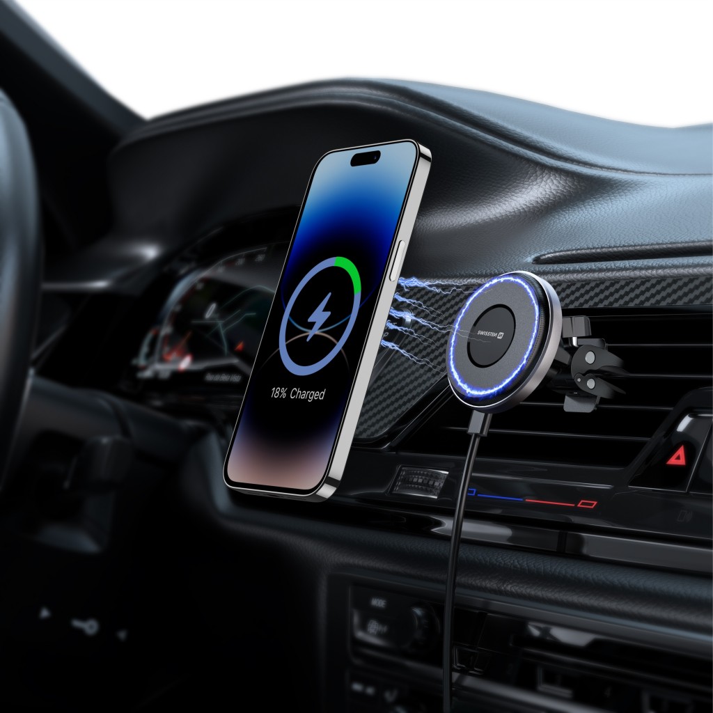 Díky silným magnetům a podpoře MagSafe pevně drží iPhone nebo jiné kompatibilní zařízení a zároveň ho bezdrátově nabíjí výkonem až 15 W (pro iPhone 7,5 W). Už žádné obavy z pádu telefonu během jízdy!