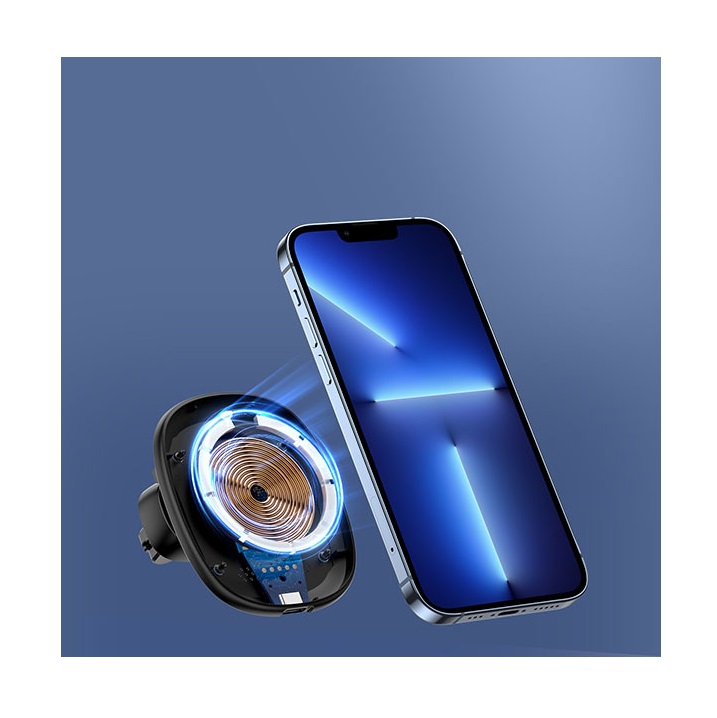Držák funguje na magnetickém principu. Je určen k připevnění na větrací mřížku ve vozidle.