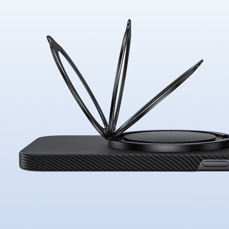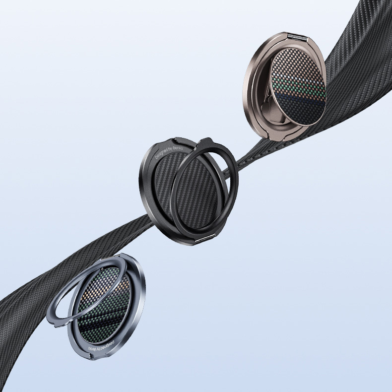 Držák zaujme na první pohled svým propracovaným designem. Tělo produktu má sofistikovaný kevlarový vzor, který mu dodává moderní a technický vzhled. Povrch je laděn do elegantní zlaté barvy, která působí luxusním dojmem. Uprostřed se nachází kovový kroužek, který je hladký a příjemný na dotek. Celý produkt je navržen s důrazem na minimalismus a funkčnost, což dokazuje jeho ultra tenký profil. Díky tloušťce pouhých 0,39 cm nepřidává telefonu na objemu a zachovává jeho elegantní linie.