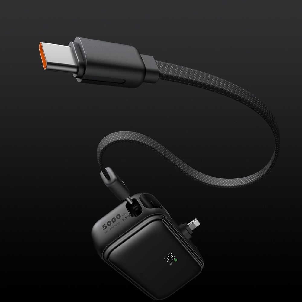 Power banka Mcdodo FreeKit Series MC-7800 se pyšní **minimalistickým a moderním designem**. Její **kompaktní rozměry** a **nízká hmotnost** zajišťují snadnou přenositelnost, ať už ji nosíte v kapse, batohu nebo kabelce. Matný černý povrch dodává zařízení **prémiový vzhled** a je příjemný na dotek. Integrovaný **Lightning kabel** je elegantně zasunut do těla power banky, což eliminuje potřebu nosit další kabely a zároveň chrání konektor před poškozením. Praktické **textilní poutko** usnadňuje přenášení a umožňuje bezpečné uchycení. Na boku power banky naleznete také **USB-C port** pro nabíjení samotné power banky nebo pro nabíjení dalších zařízení.