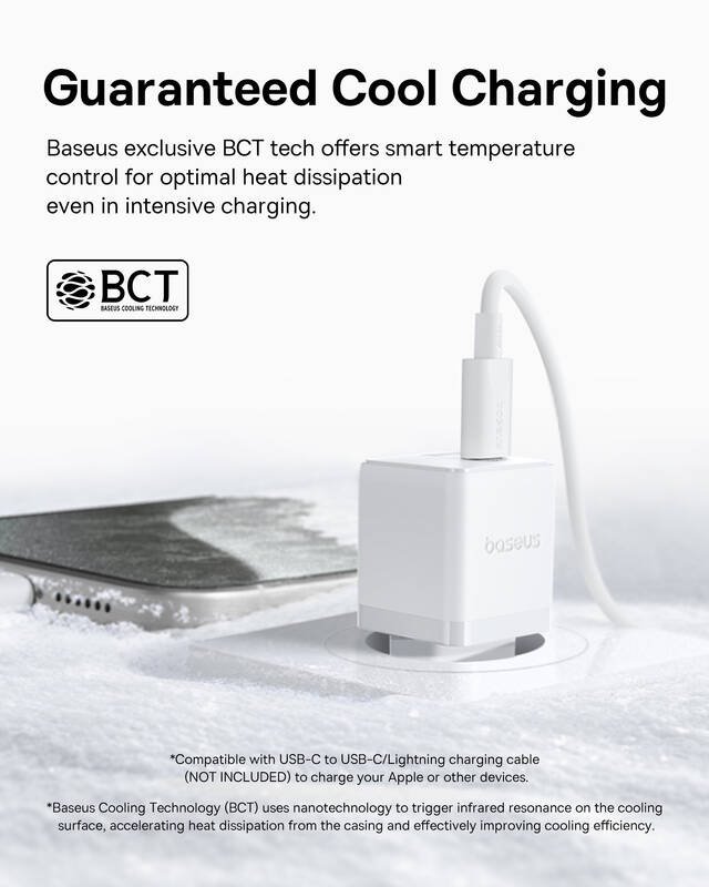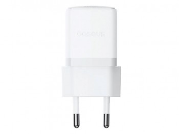 Tělo nabíječky je vyrobeno z kvalitního a odolného polykarbonátu v čistě bílé barvě. Design je navržen s důrazem na minimalismus a praktičnost. Má kompaktní, téměř čtvercový tvar se zaoblenými hranami, díky čemuž se pohodlně drží a snadno přenáší. Na přední straně se nachází decentní logo Baseus a jediný, precizně zpracovaný USB-C port. Díky svým miniaturním rozměrům v zásuvce nepřekáží a neblokuje okolní zdířky.