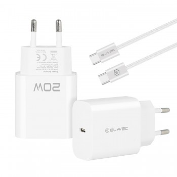 Nabíječka Blavec BC-9 – typ C – PD 20W 3A s kabelem typu C na typ C (TCBC9-CW203A+CC) bíláThe images show a compact, white wall charger with a single USB-C port. The Blavec logo is visible on the side. It comes with a white USB-C to USB-C cable. The design is minimalist and sleek. The charger has standard EU plugs. Now I can construct the HTML product description.