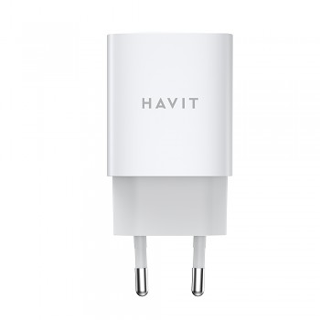 Design nabíječky Havit UC45W je minimalistický a funkční. Její kompaktní rozměry a čistě bílá barva s matným povrchem ji předurčují k diskrétnímu umístění v jakémkoli interiéru. Tvar nabíječky je elegantně obdélníkový se zaoblenými hranami, což podtrhuje její moderní vzhled. Na horní straně jsou přehledně umístěny dva porty USB-C, každý s označením pro Power Delivery 45W, což usnadňuje orientaci při připojování zařízení. Logo Havit je decentně umístěno na boku, což dodává produktu punc kvality a stylu.