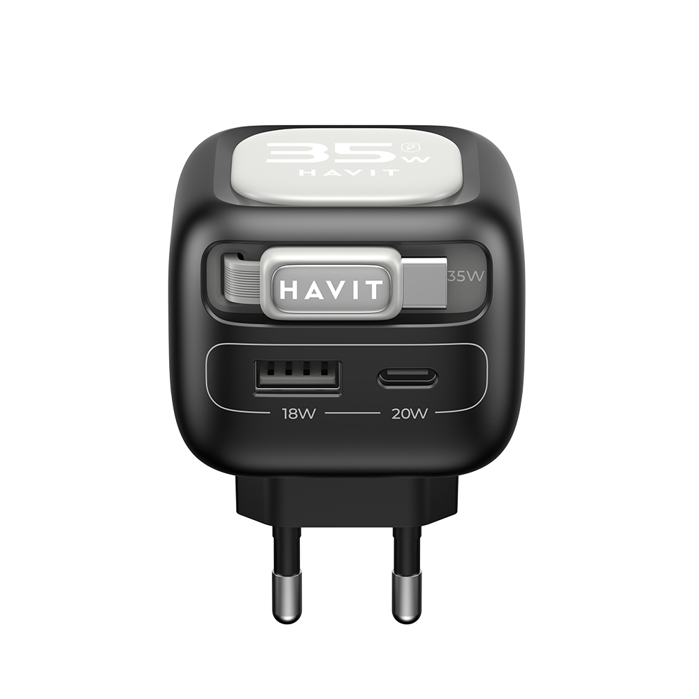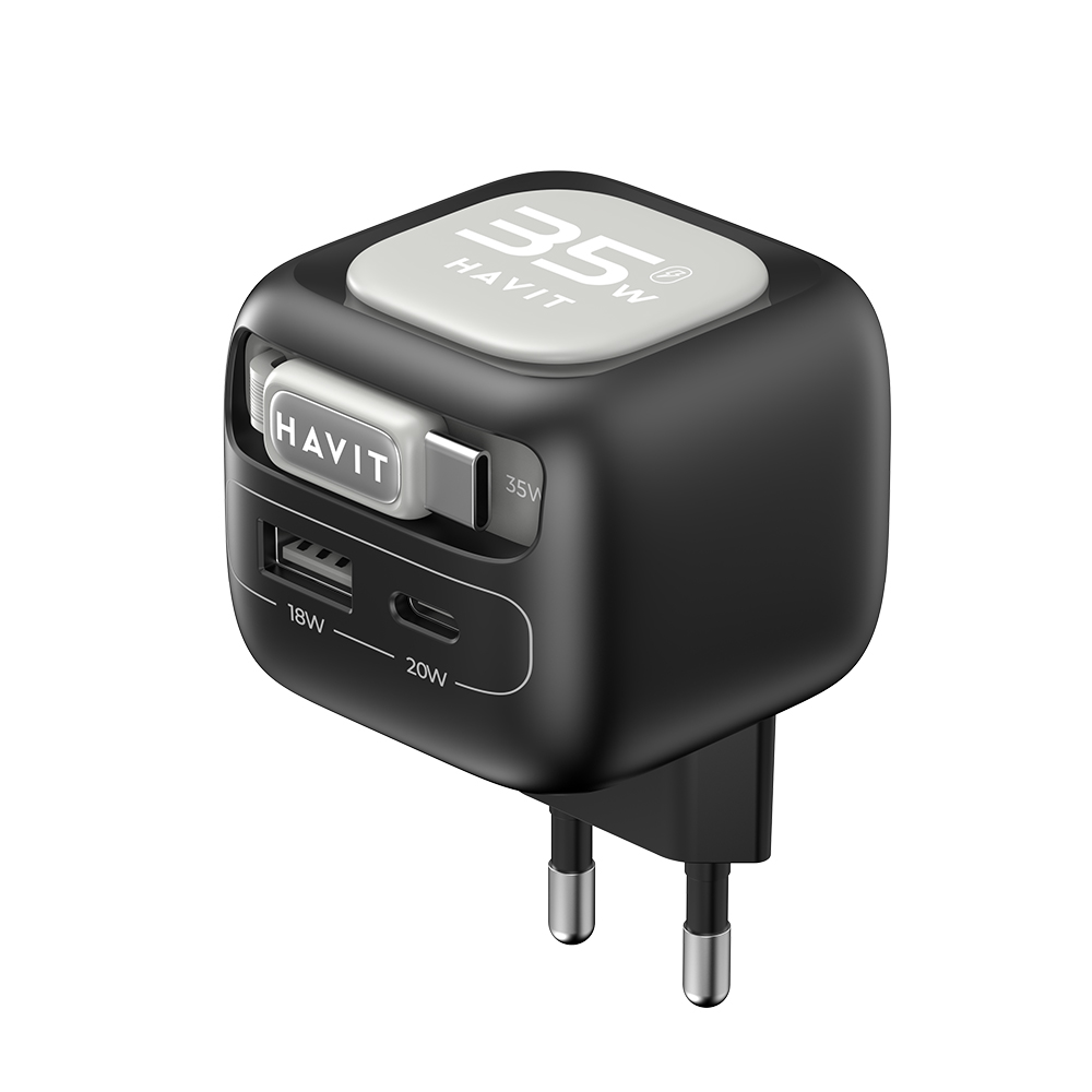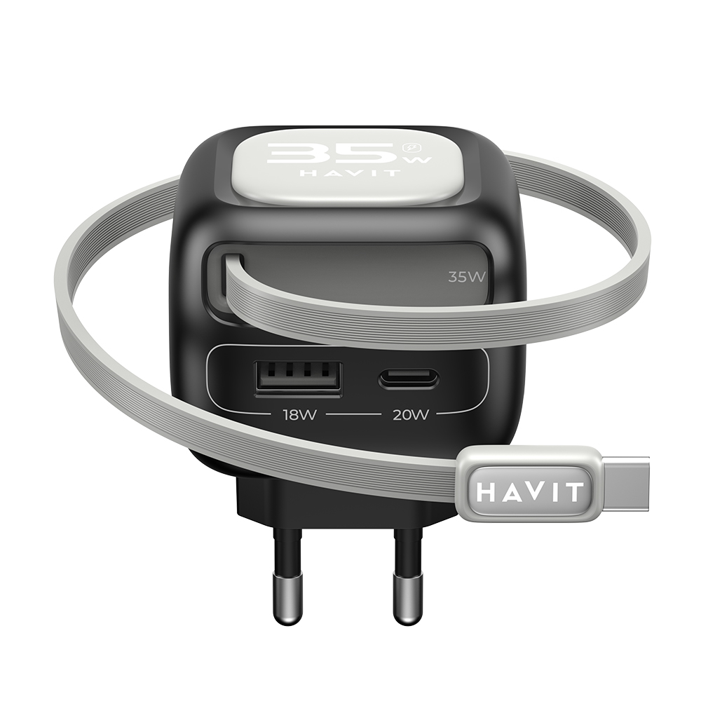 Nabíječka Havit UC251 EU se pyšní moderním a minimalistickým designem. Její kompaktní, zaoblený čtvercový tvar v elegantní černé barvě s šedými detaily se snadno vejde do každé tašky či batohu. Dominantním prvkem je integrovaný výsuvný kabel Type-C, který je chytře ukryt v těle nabíječky a v případě potřeby se snadno vysune. Na přední straně naleznete přehledně označené porty USB-A a USB-C, zatímco horní část zdobí decentní logo Havit a označení výkonu 35W. Díky svým rozměrům a promyšlené konstrukci je tato nabíječka ideální pro cestování i každodenní použití doma či v kanceláři.