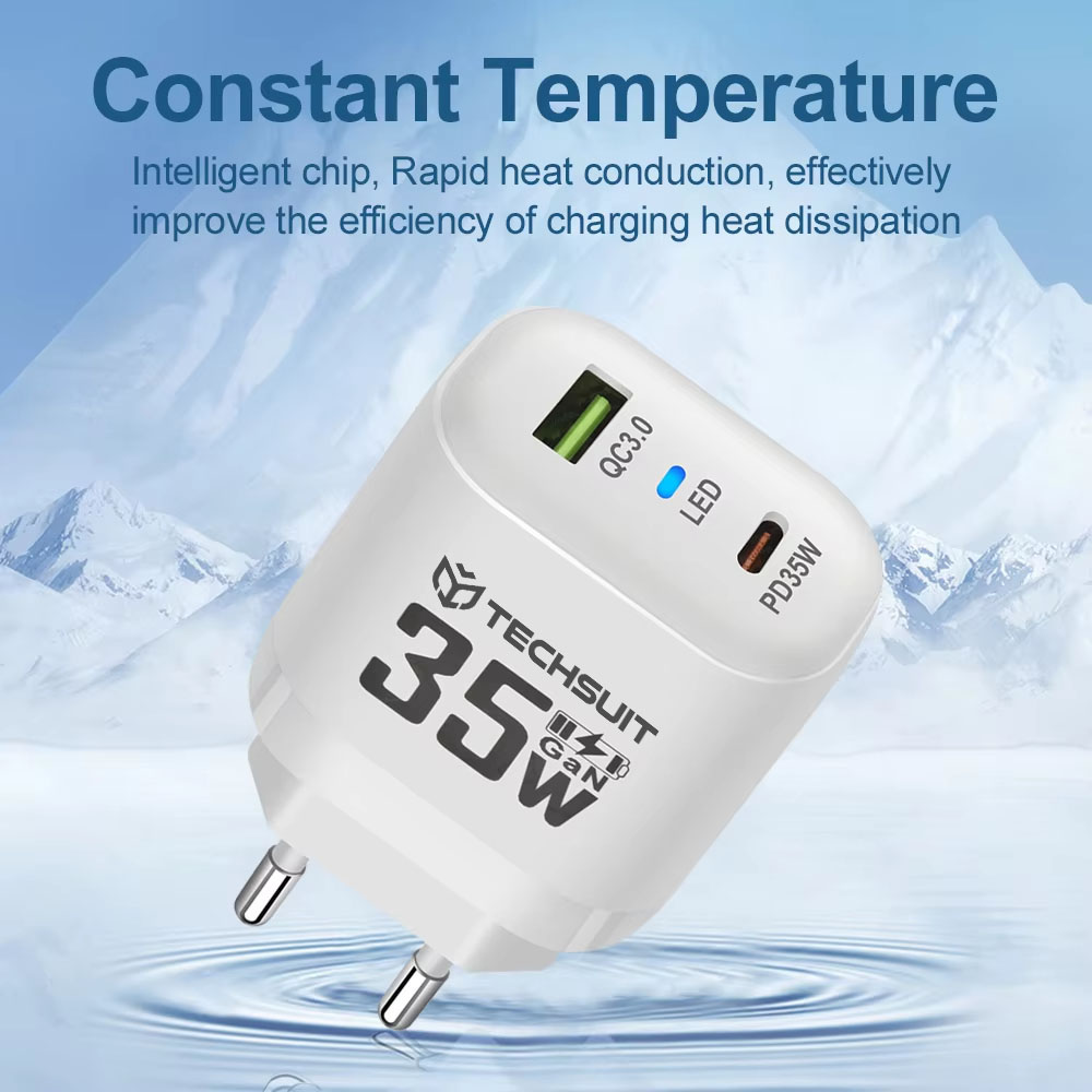 Nabíječka Techsuit CHPD174 se pyšní minimalistickým a funkčním designem. Její kompaktní, obdélníkové tělo s jemně zaoblenými hranami a matným černým povrchem působí elegantně a moderně. Na přední straně je decentně umístěno logo TECHSUIT a výrazné označení "35W GaN", které podtrhuje její technologickou vyspělost. Mezi porty USB-C a USB-A je integrována LED dioda, která signalizuje stav nabíjení. Standardní EU zástrčka zajišťuje univerzální použití.