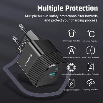 Tato nabíječka je univerzálně kompatibilní s širokou škálou mobilních telefonů, tabletů a dalších elektronických zařízení, které podporují nabíjení přes USB-A (QC3.0) a USB-C (PD25W). Je ideální pro modely telefonů iPhone, Samsung, Xiaomi, Huawei a mnoho dalších, které vyžadují rychlé a efektivní nabíjení.
