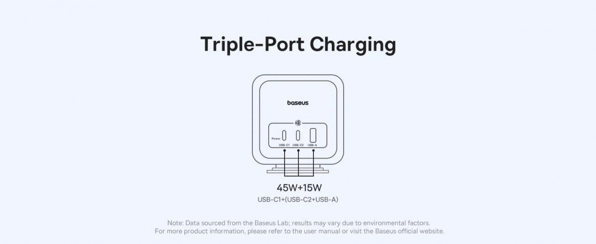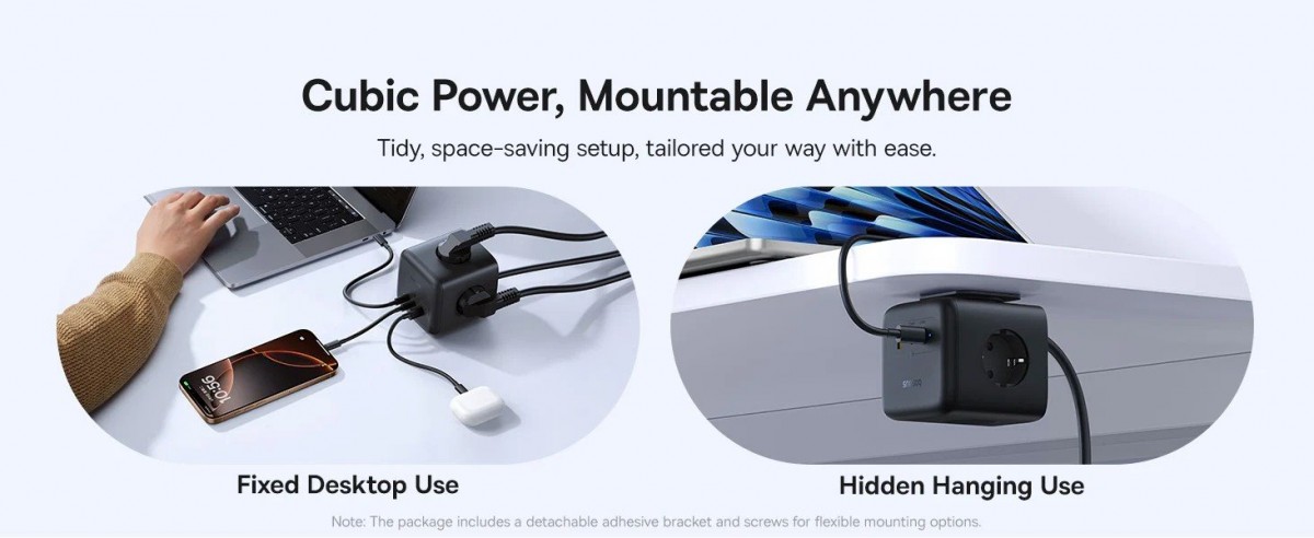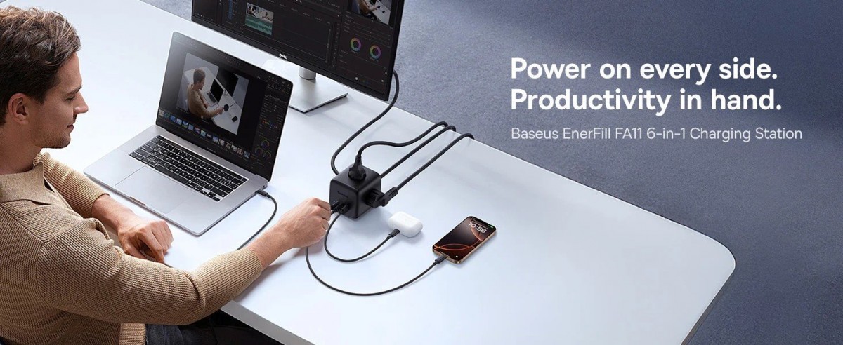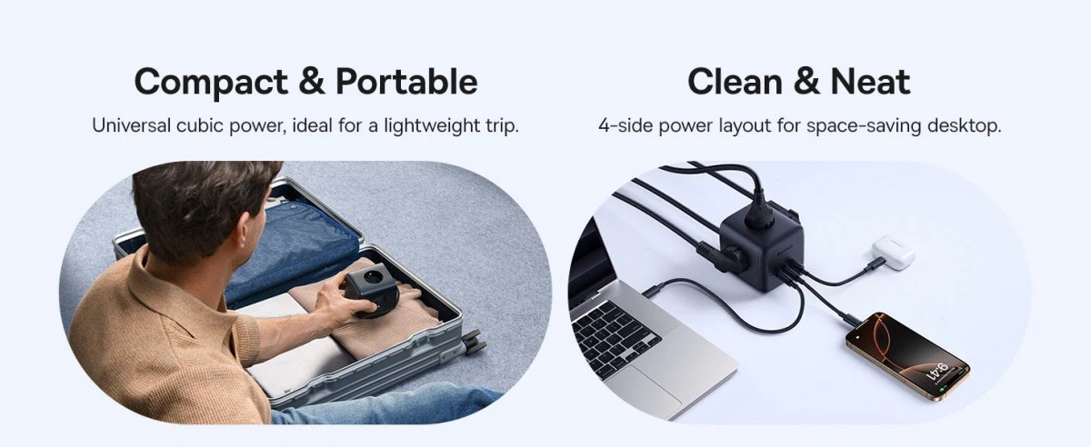 Nabíjecí stanice Baseus EnerFill se pyšní minimalistickým a funkčním designem, který šetří místo a udržuje pořádek na vašem stole. Její kompaktní tělo je navrženo pro snadné přenášení. Klíčovým prvkem je chytré rozmístění tří AC zásuvek na různých stranách stanice. Toto řešení zajišťuje, že si ani objemnější adaptéry navzájem nepřekáží a vy můžete využít všechny porty naplno. Na čtvrté straně naleznete přehledně uspořádané USB porty a jediné ovládací tlačítko, které slouží pro bezpečné zapnutí a vypnutí. Při přetížení se napájení automaticky přeruší, což chrání vaše zařízení.