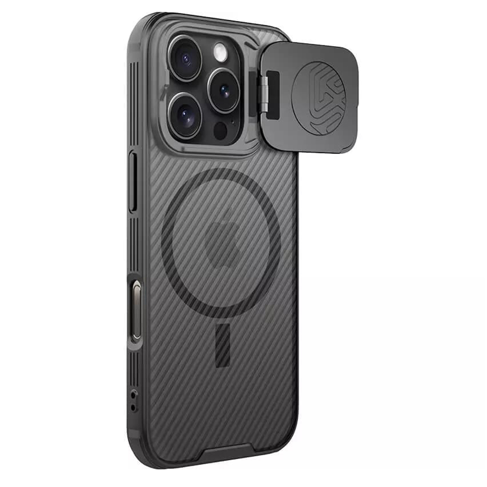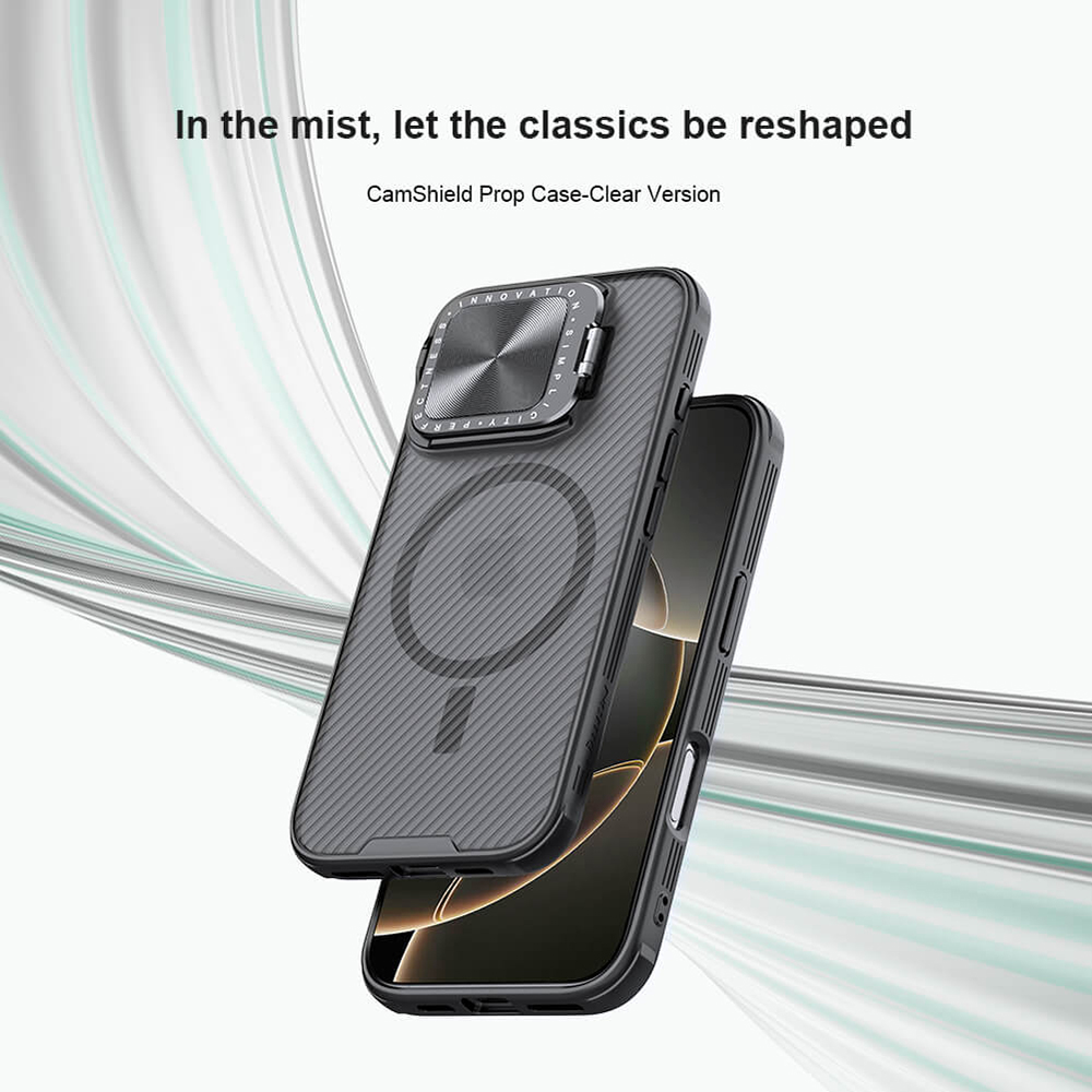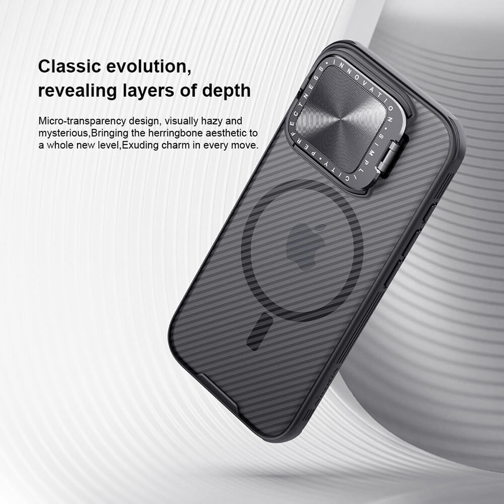 Pouzdro Nillkin CamShield Prop Magnetic se pyšní moderním transparentním černým provedením, které nechá vyniknout originální design vašeho telefonu, zatímco mu dodá sofistikovaný nádech. Zadní strana je opatřena jemnou, ale výraznou texturou s diagonálními pruhy, která nejen skvěle vypadá, ale také zlepšuje úchop a minimalizuje otisky prstů. Klíčovým prvkem je integrovaný posuvný kryt fotoaparátu, který spolehlivě chrání čočky před poškrábáním a prachem, a navíc slouží jako praktický stojánek pro pohodlné sledování obsahu. Díky vestavěnému magnetickému kroužku je pouzdro plně kompatibilní s technologií MagSafe, což zajišťuje bezproblémové bezdrátové nabíjení a použití magnetického příslušenství. Kryt je vyroben z kombinace prvotřídního polykarbonátu (PC) a flexibilního TPU, což zaručuje vysokou odolnost proti nárazům a pádům, zatímco přesné výřezy a kryté tlačítka zajišťují snadný přístup ke všem funkcím telefonu.