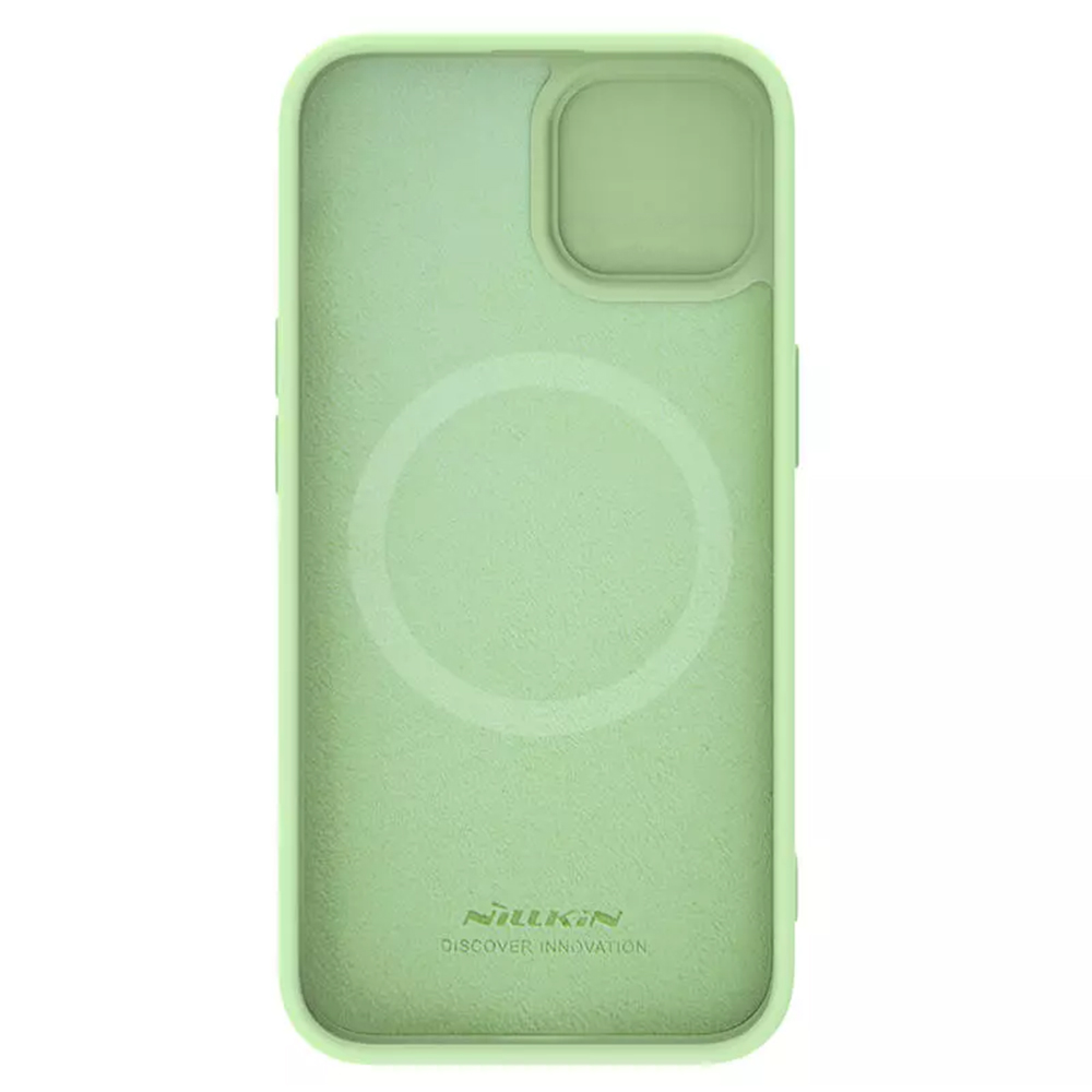 Kryt Nillkin CamShield Silky MagSafe Silicone se pyšní minimalistickým a elegantním designem v atraktivní mátově zelené barvě. Hladký, matný povrch silikonu je příjemný na dotek a zabraňuje vyklouznutí telefonu z ruky. Zvýšené okraje kolem displeje a fotoaparátu poskytují dodatečnou ochranu proti poškrábání při položení na rovný povrch. Dominantním prvkem zadní strany je praktický posuvný kryt, který elegantně chrání modul fotoaparátu a zároveň dodává krytu osobitý vzhled.